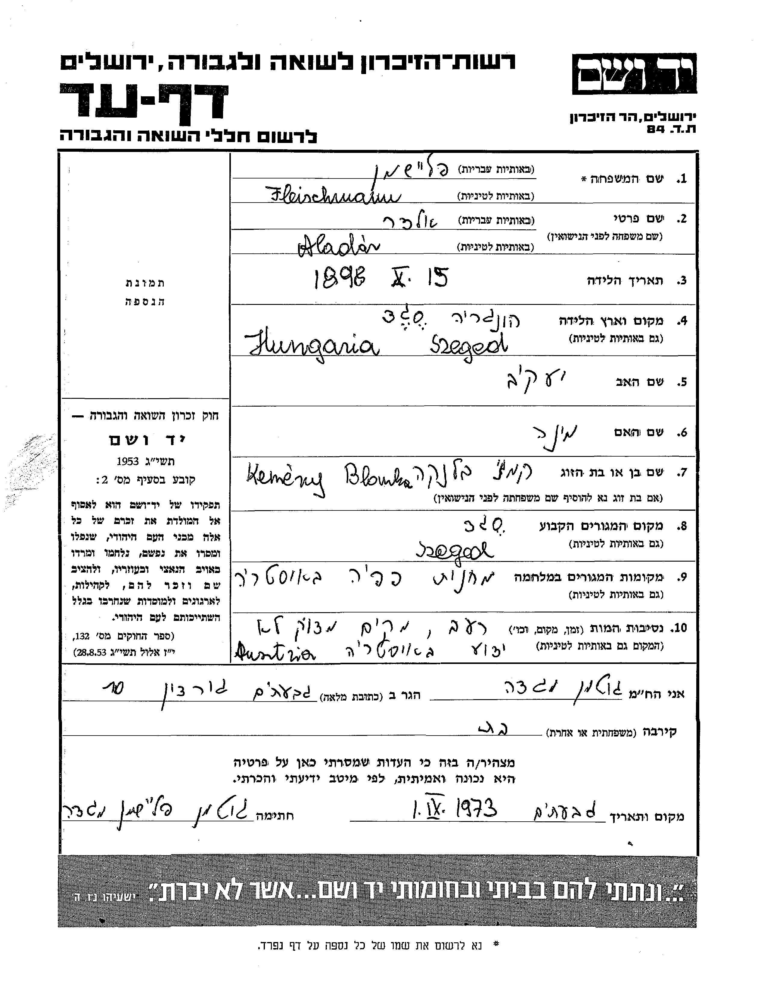 Aladar Fleischmann wurde im Jahr 1898 in Szeged, Ungarn geboren. Er war der Sohn von Yaakov und Mina. Vor dem Zweiten Weltkrieg lebte er in Szeged, Ungarn. Während des Krieges war er in Österreich.