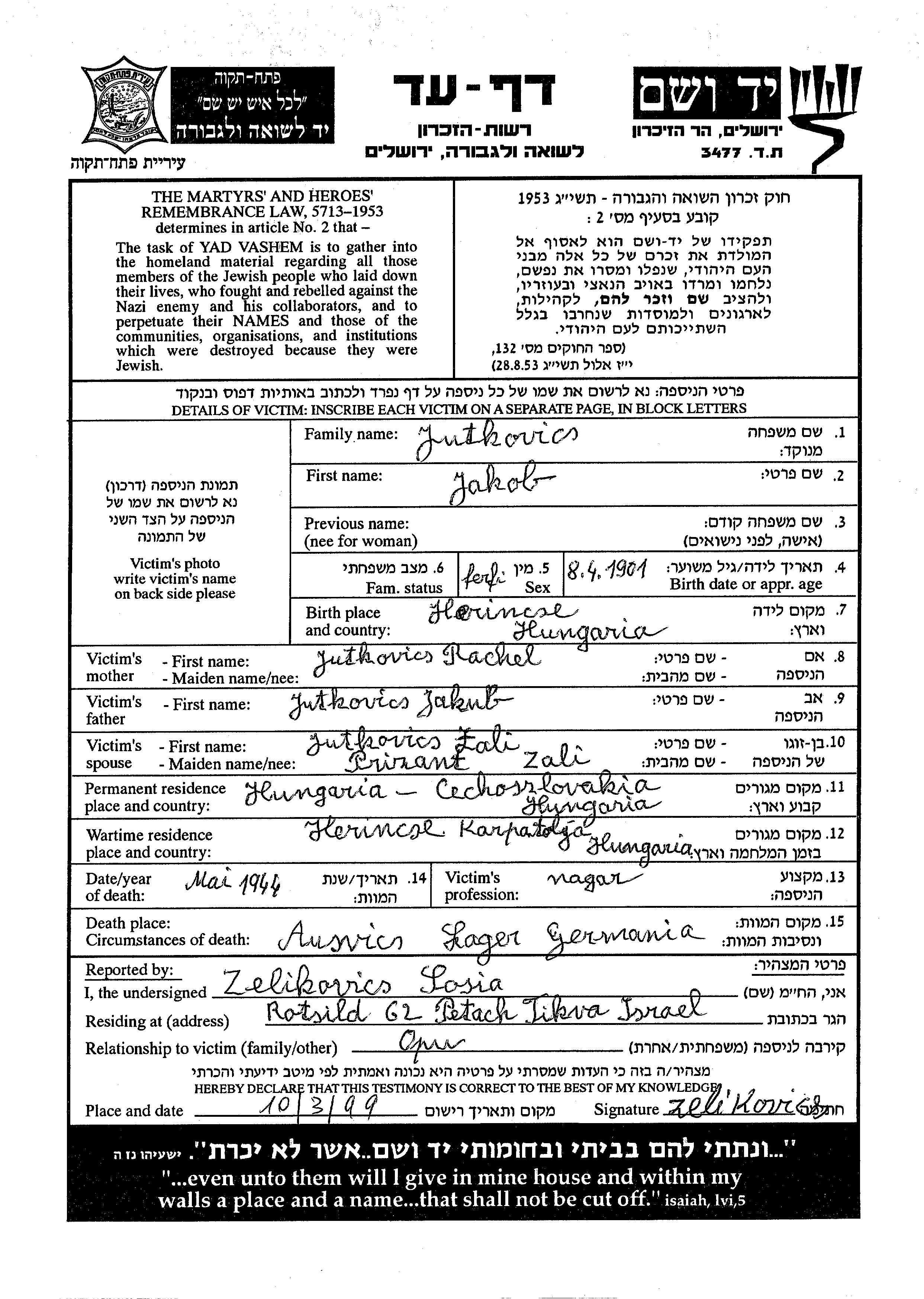 Jakob Jutkovics wurde im Jahr 1901 in Herincse, Tschechoslowakei geboren. Er war der Sohn von Yakub und Rachel. Er war Zimmermann und mit Zali, geb. Prizant Verheiratet. Vor dem Zweiten Weltkrieg lebte er in Herincse, Tschechoslowakei. Während des Krieges war er in Herincse, Tschechoslowakei.