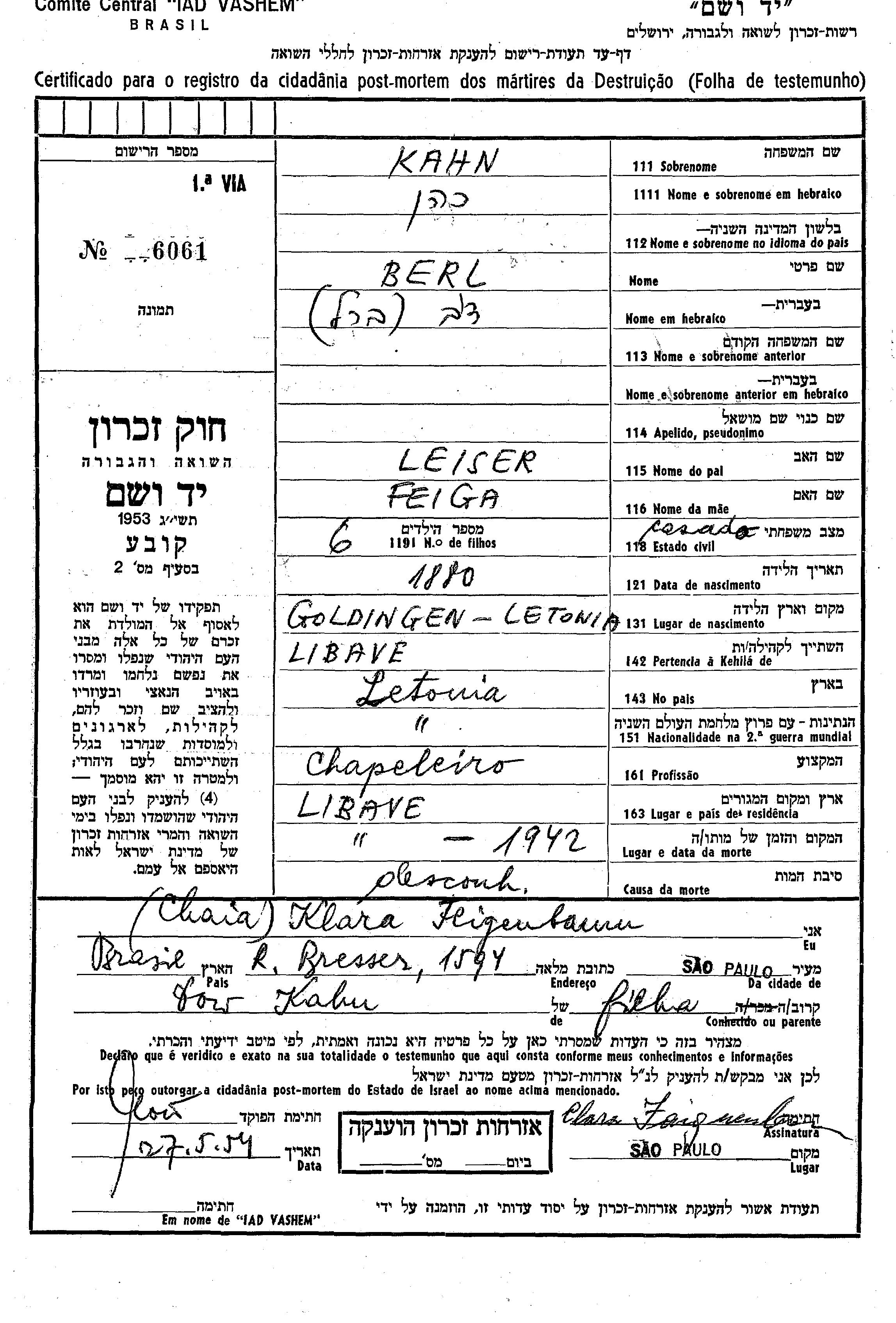 Berl Dov Kahn Kohen wurde im Jahr 1880 in Goldingen, Lettland geboren. Er war der Sohn von Leiser und Feiga. Er war Hutmacher/-in und Verheiratet. Vor dem Zweiten Weltkrieg lebte er in Libava, Lettland. Während des Krieges war er in Libava, Lettland.
