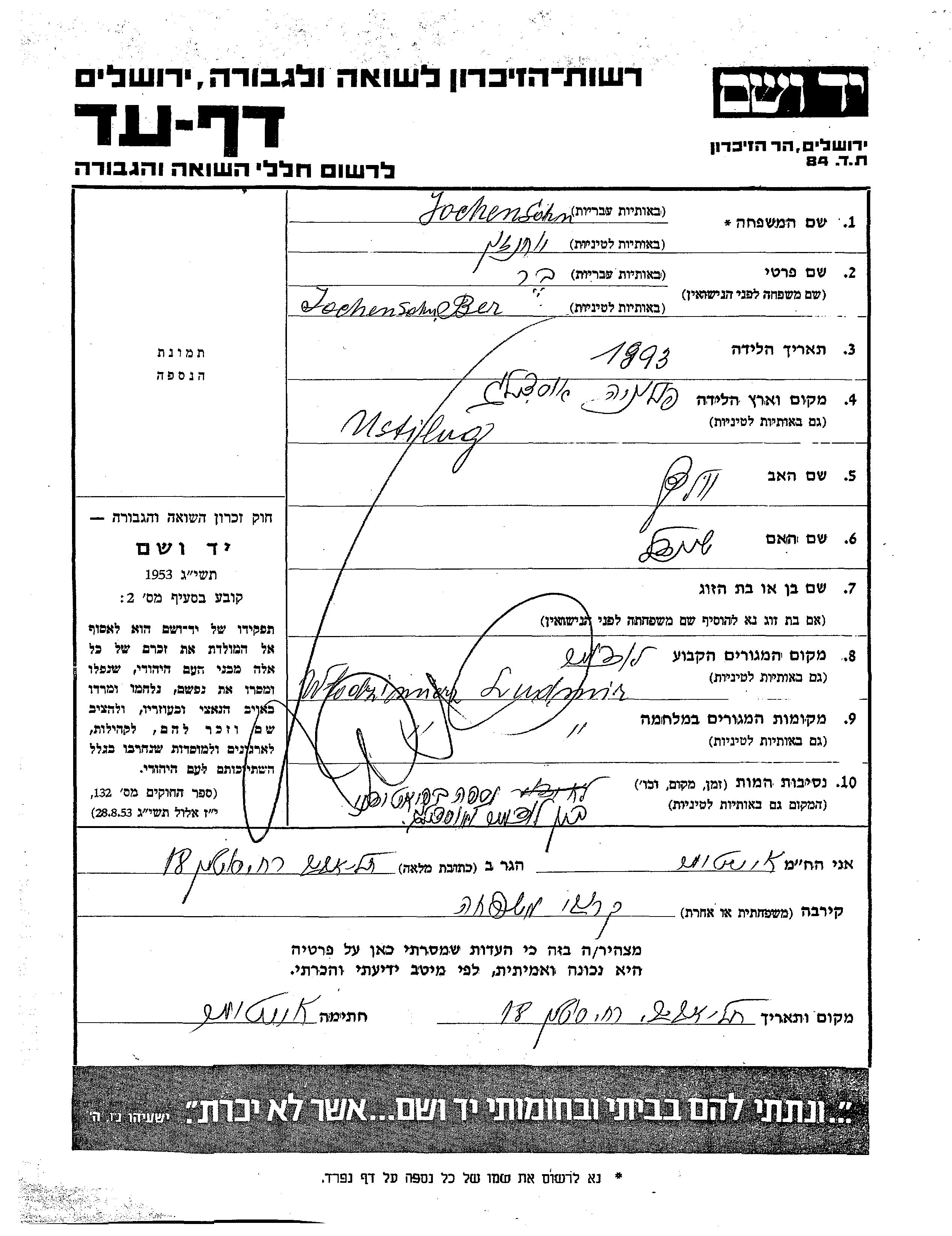 Ber Jochensohn wurde im Jahr 1893 in Ustilug, Polen geboren. Er war der Sohn von Volf und Sheindl. Vor dem Zweiten Weltkrieg lebte er in Ludmir, Polen. Während des Krieges war er in Ludmir, Polen.