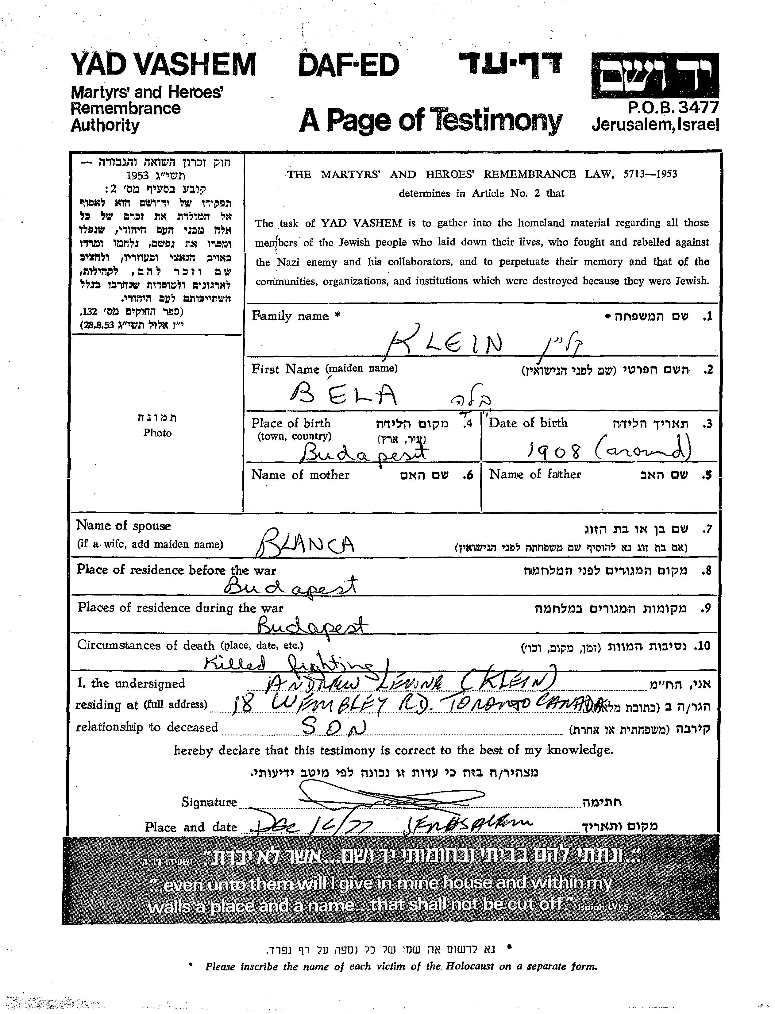 Bela Name unbekannt wurde im Jahr 1908 in Budapest, Ungarn geboren. Sie war mit Blanca Verheiratet. Vor dem Zweiten Weltkrieg lebte sie in Budapest, Ungarn. Während des Krieges war sie in Budapest, Ungarn.