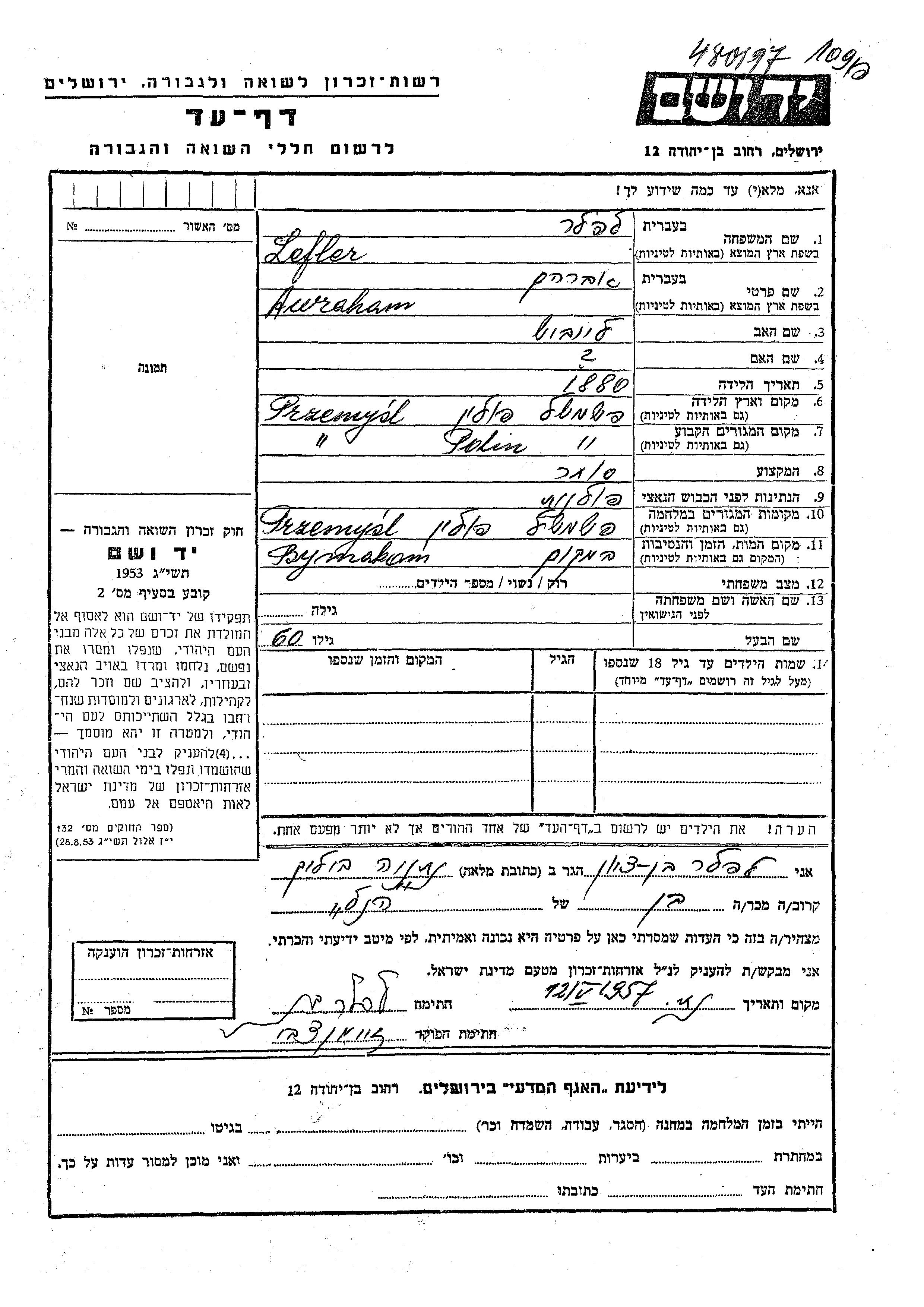 Avraham wurde in der Schoah ermordet. Todesort: Przemysl, Polen.
