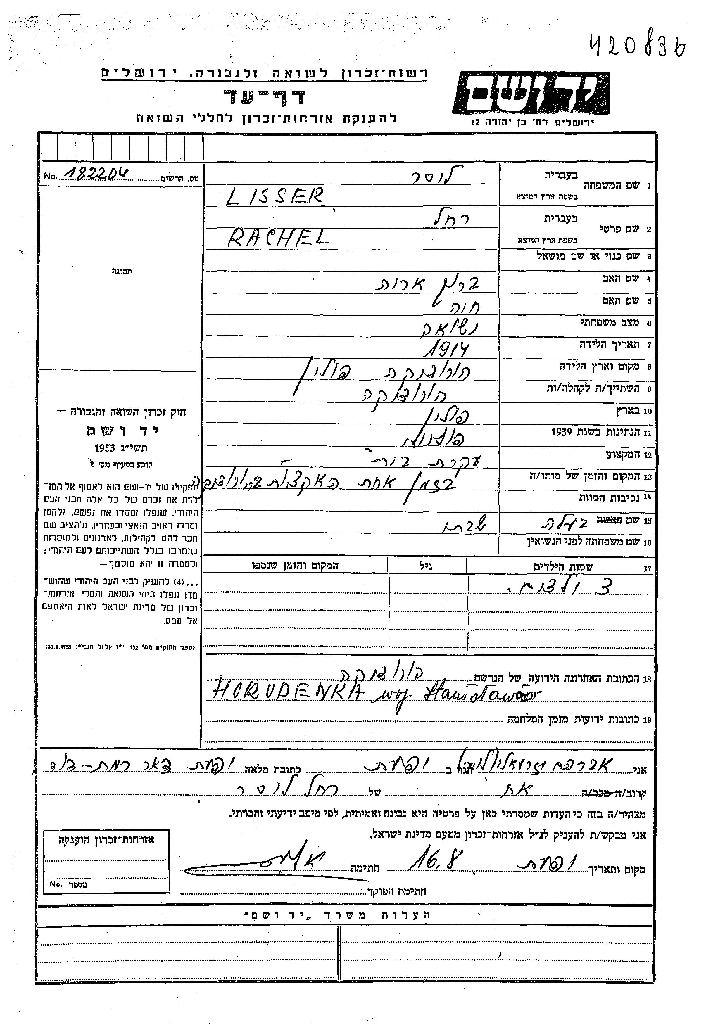Rachel Lisser wurde im Jahr 1914 in Horodenka, Polen geboren. Sie war die Tochter von Barukh Arie und Khaia. Sie war Hausfrau und mit Shabtai Verheiratet. Vor dem Zweiten Weltkrieg lebte sie in Horodenka, Polen. Während des Krieges war sie in Horodenka, Polen.