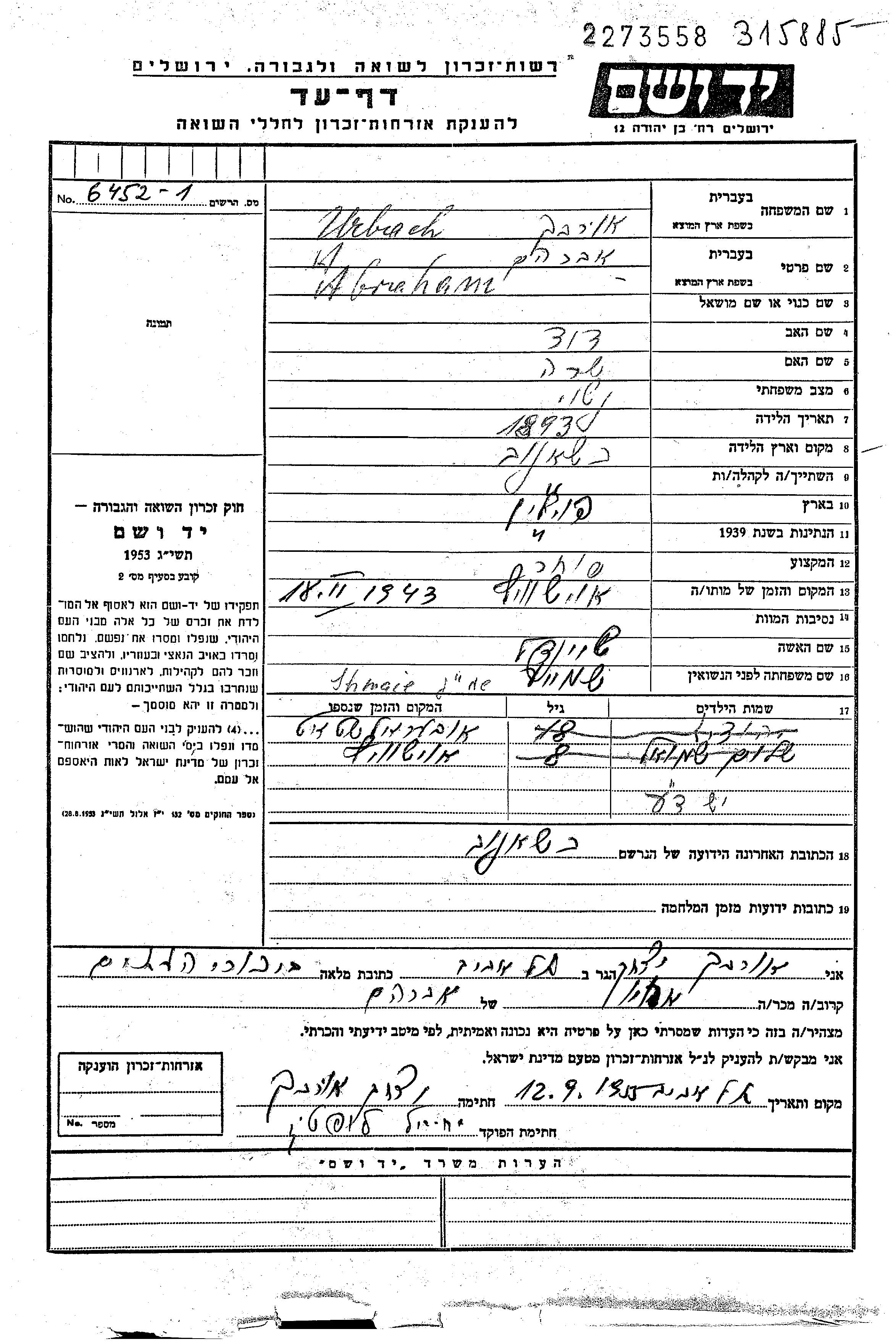 Abraham Isakhar Urbakh wurde im Jahr 1893 in Chrzanow, Polen geboren. Er war Kaufmann/-frau. Vor dem Zweiten Weltkrieg lebte er in Chrzanow, Polen.