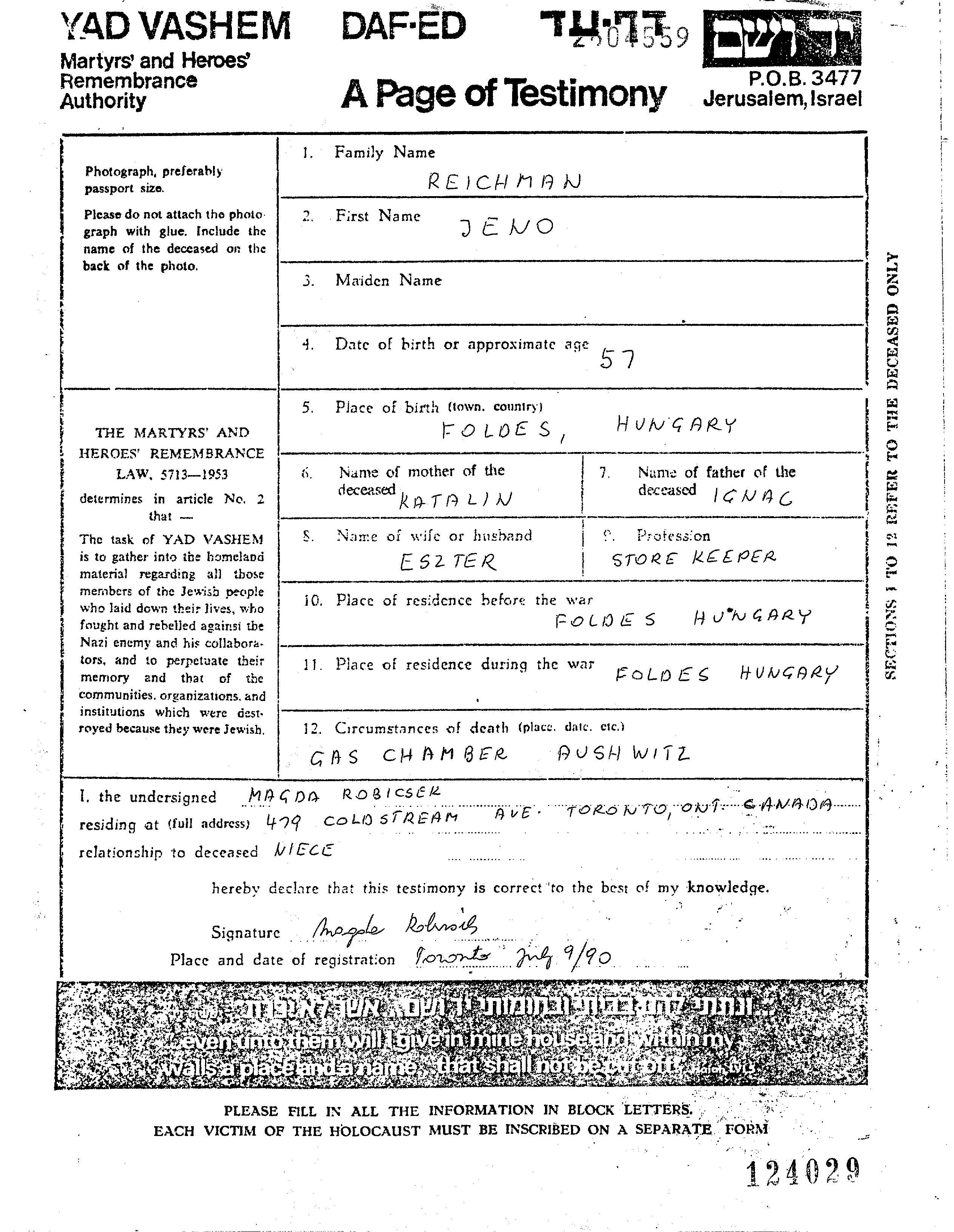 Reichman | Jeno | 1891 | Foldes, Ungarn | Liste von ermordeten Personen |