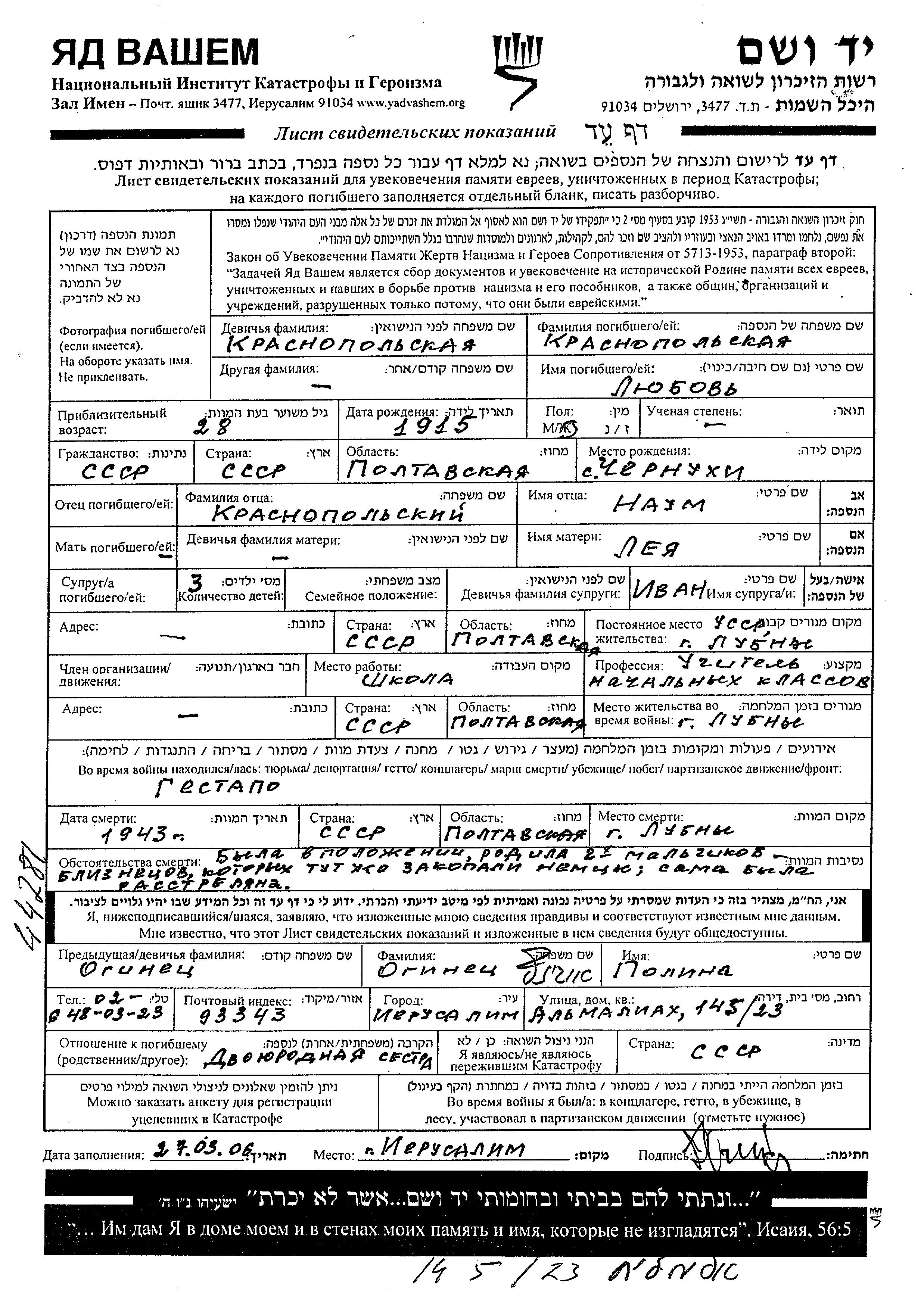 Lyubov Krasnopolskaya wurde im Jahr 1915 in Chernukhi, Ukraine (UdSSR) geboren. Sie war Lehrer/in. Vor dem Zweiten Weltkrieg lebte sie in Lubny, Ukraine (UdSSR).
