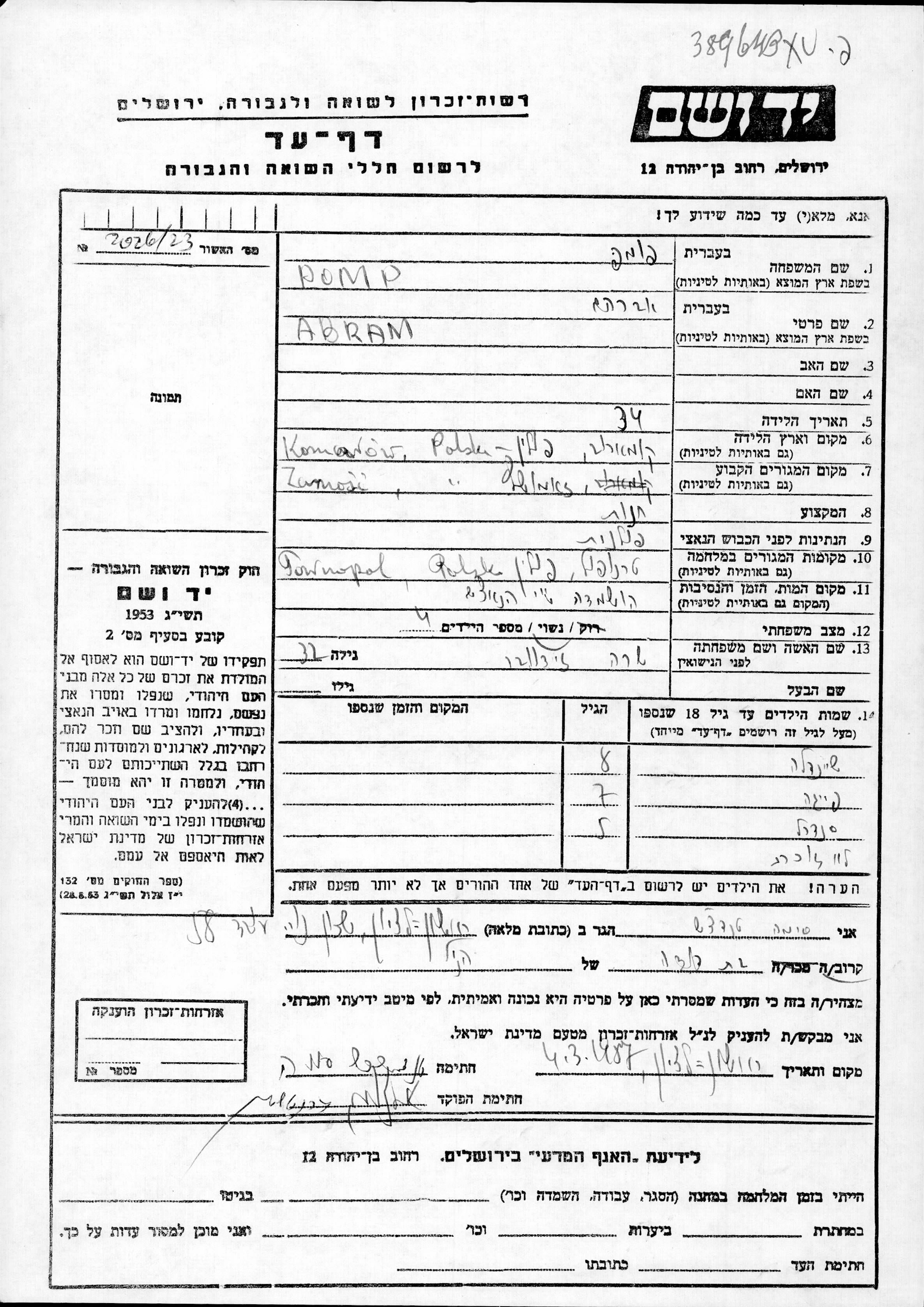 Sendrel Pomp wurde Er war der Sohn von Abram und Sara, geb. Zeidveber. Er war Kind. Vor dem Zweiten Weltkrieg lebte er in Zamosc, Polen. Während des Krieges war er in Tarnopol, Polen.
