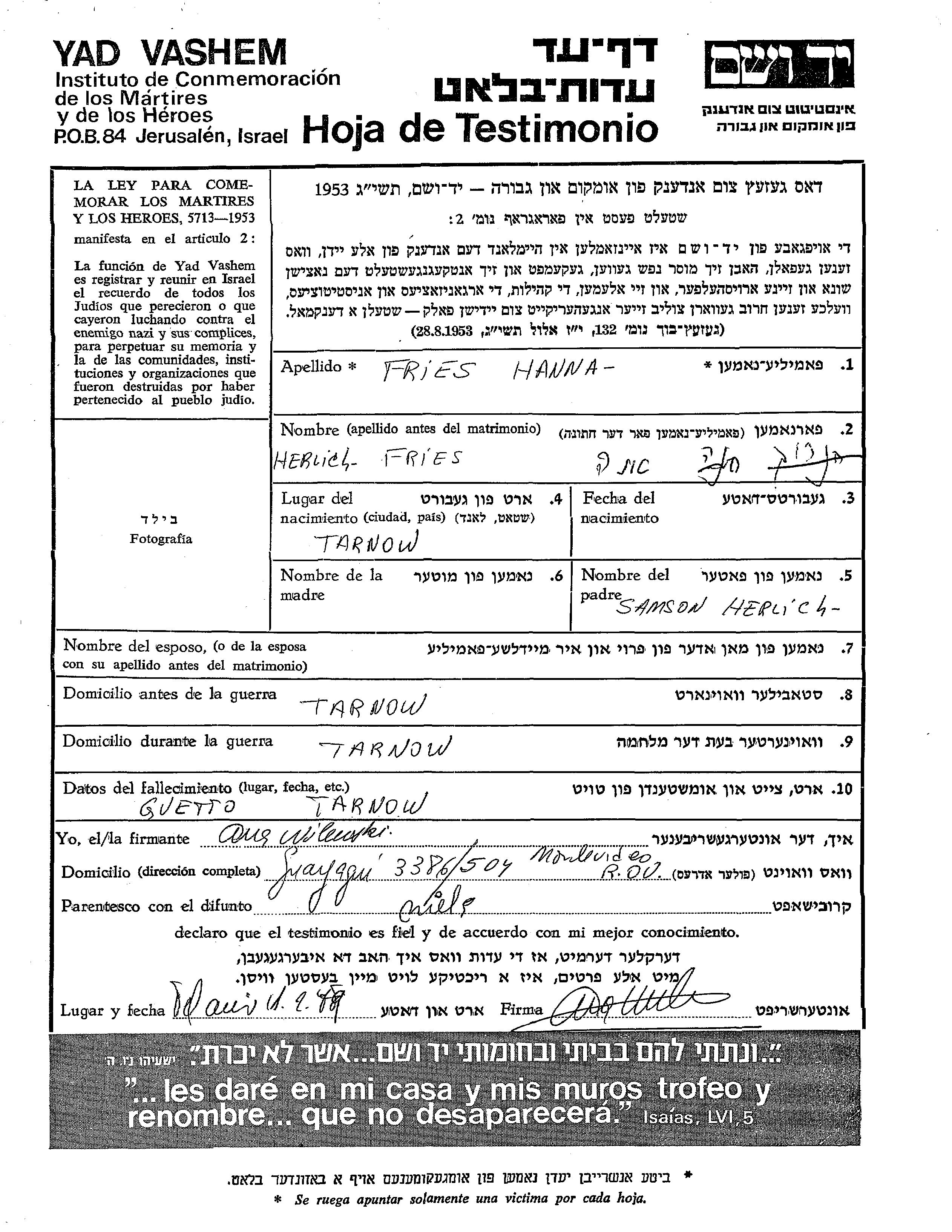 Hanna Ana Fries, geb. Herlich wurde in Tarnow, Polen geboren. Sie war die Tochter von Shimshon. Vor dem Zweiten Weltkrieg lebte sie in Tarnow, Polen. Während des Krieges war sie in Tarnow, Polen.