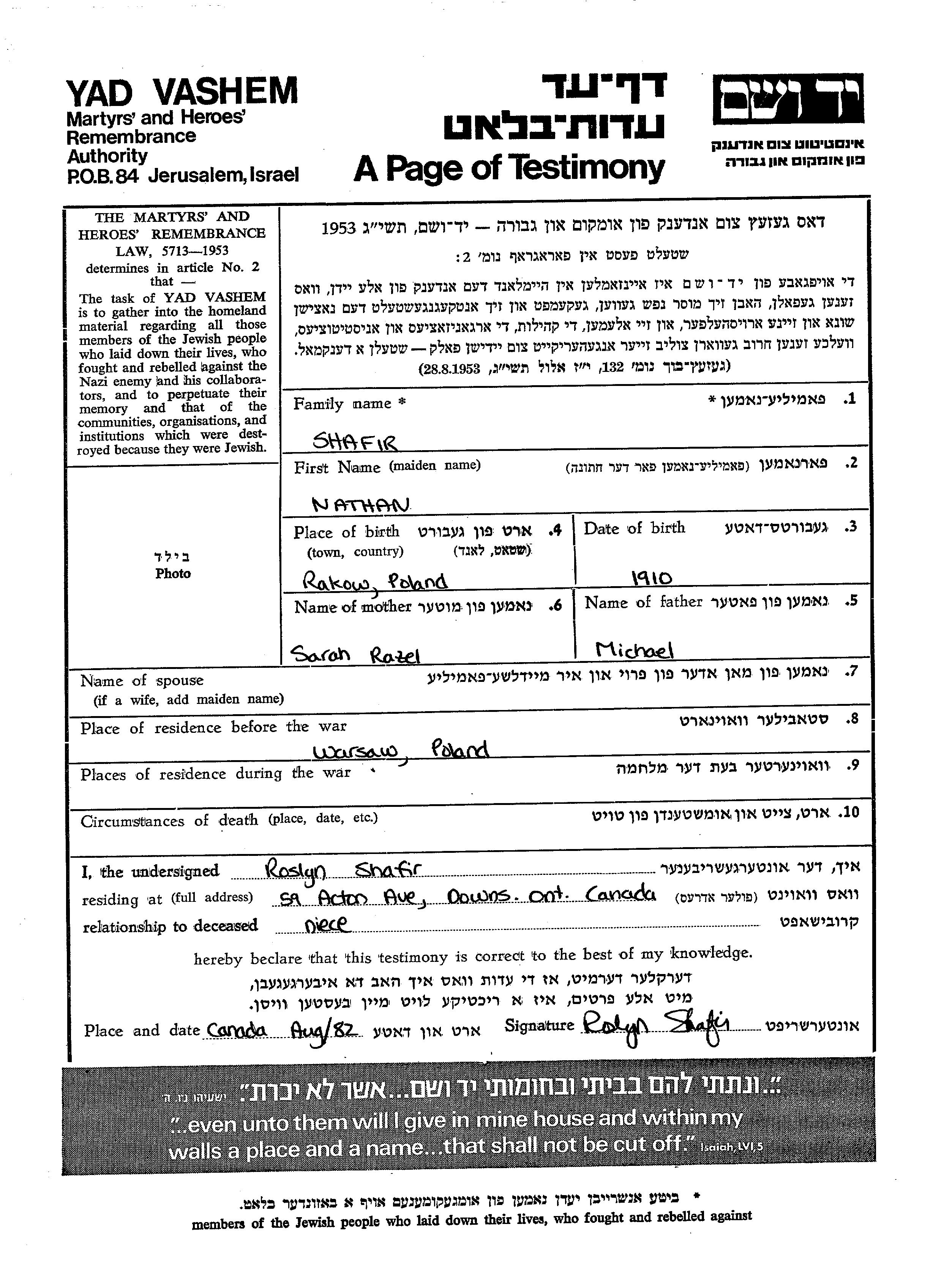 Nathan Shafir wurde im Jahr 1910 in Rakow, Polen geboren. Er war der Sohn von Michael und Sarah Razel. Vor dem Zweiten Weltkrieg lebte er in Varsha, Polen.