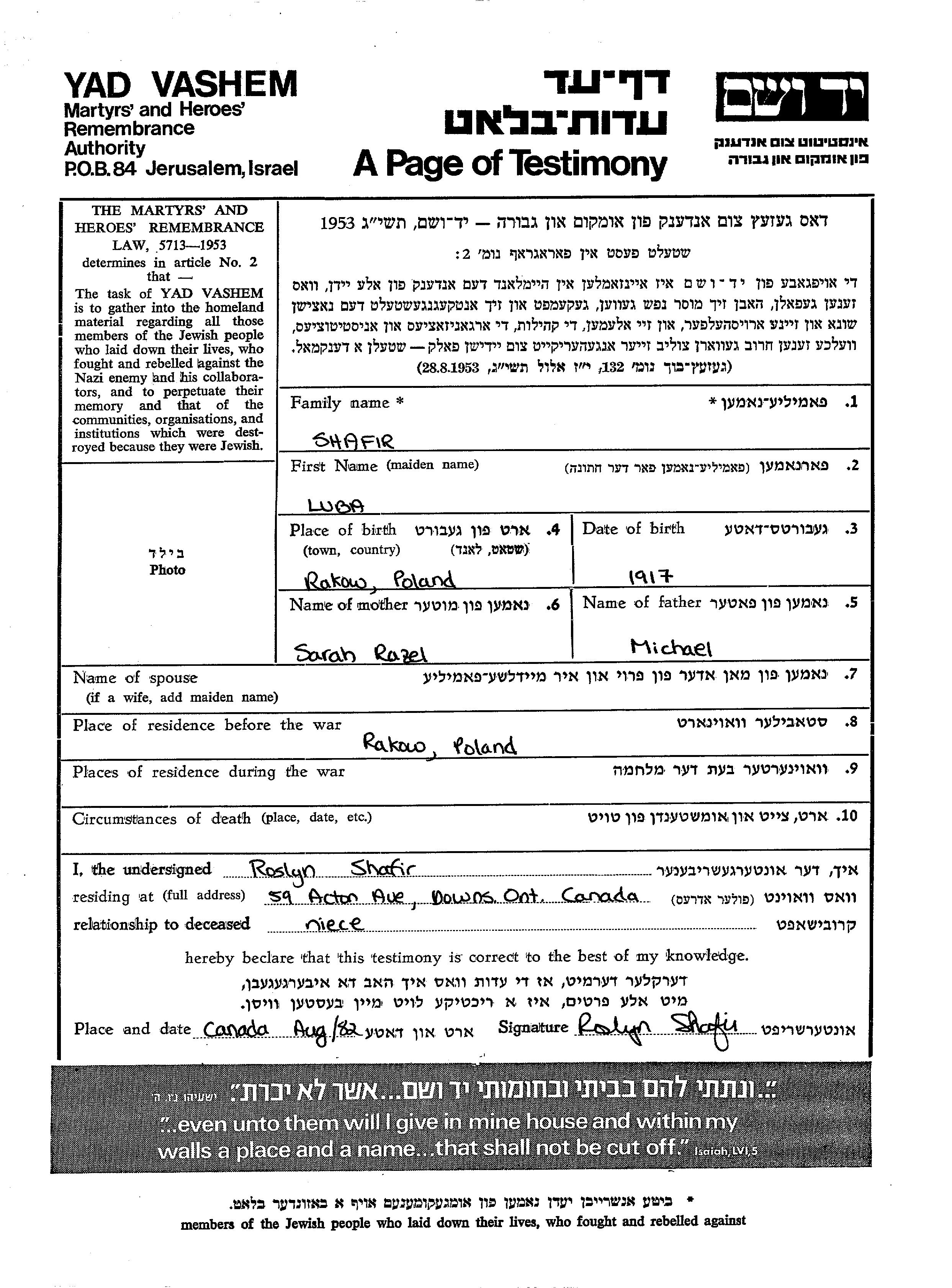Juden wurden in der Schoah auf verschiedenste Weisen ermordet, unter anderem: Vergasen, Erschiessen, lebendig verbrannt werden, lebendig begraben werden, Tod durch Erschöpfung durch Zwangsarbeit, Epidemien, mangels jeder hygienischer Bedingung oder dem Fehlen medizinischer Versorgung. Manche Juden nahmen sich das Leben, um der Festnahme und weiterer Verfolgung zu entgehen oder ihr hoffnungsloses, nicht nachlassendes Leiden zu beenden.