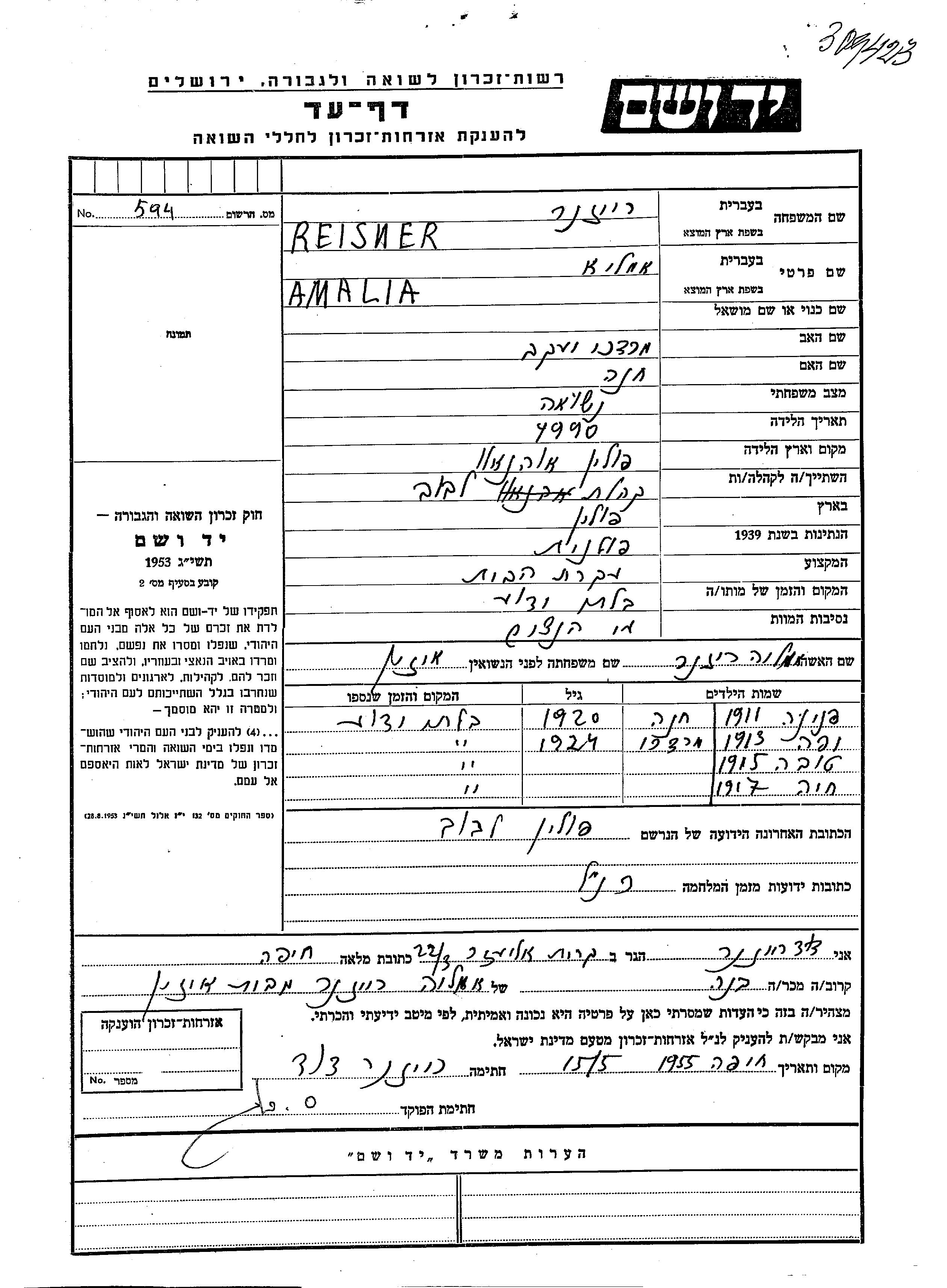 Amalia Reisner, geb. Eizen wurde im Jahr 1890 geboren. Sie war die Tochter von Mordekhai Yaakov und Khana. Sie war Hausfrau und Verheiratet. Vor dem Zweiten Weltkrieg lebte sie in Lwow, Polen. Während des Krieges war sie in Lwow, Polen.
