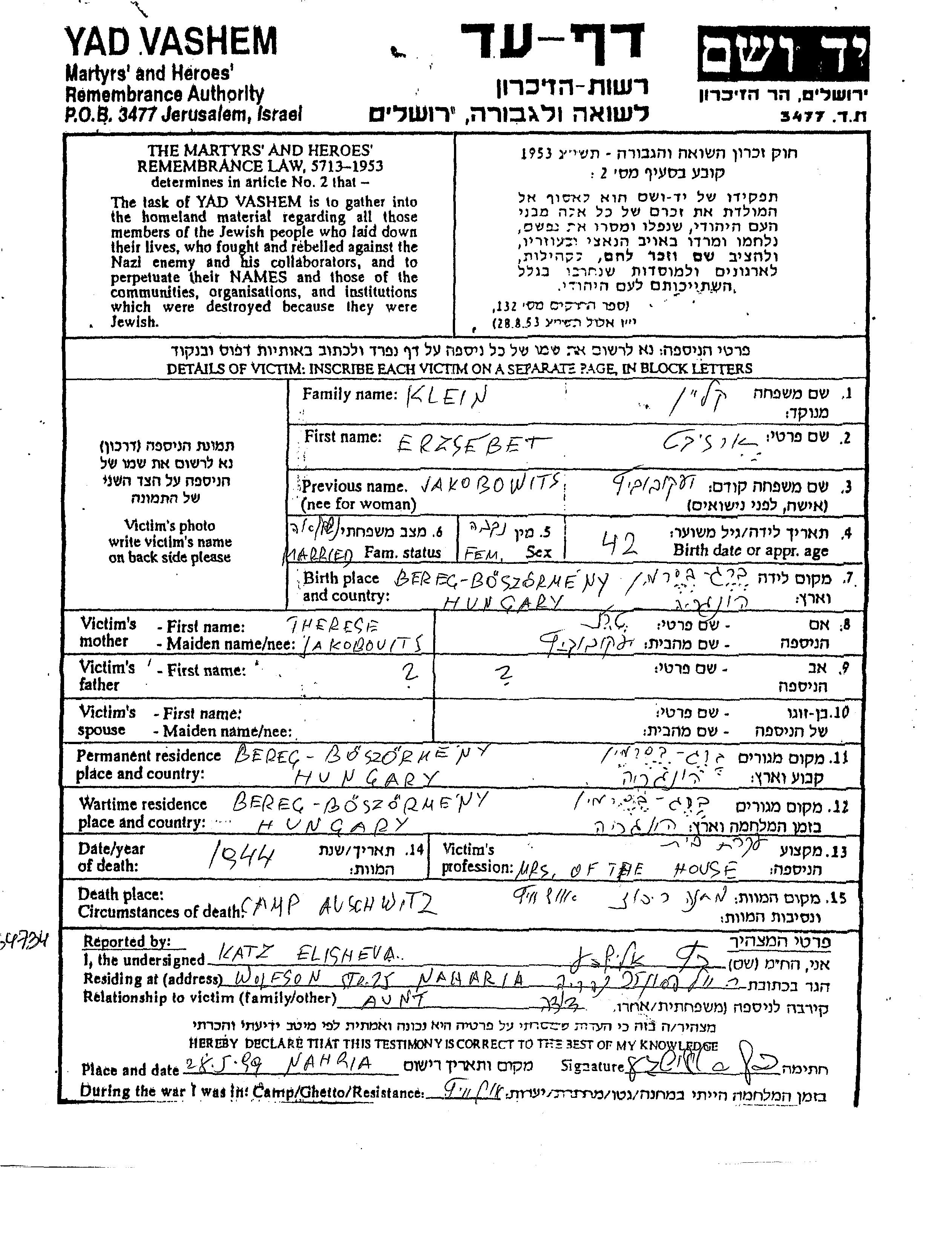 | Klein | Erzsebet | 1901 | Berekboszormeny, Ungarn | Aufzeichnungen ueber verfolgte Personen |