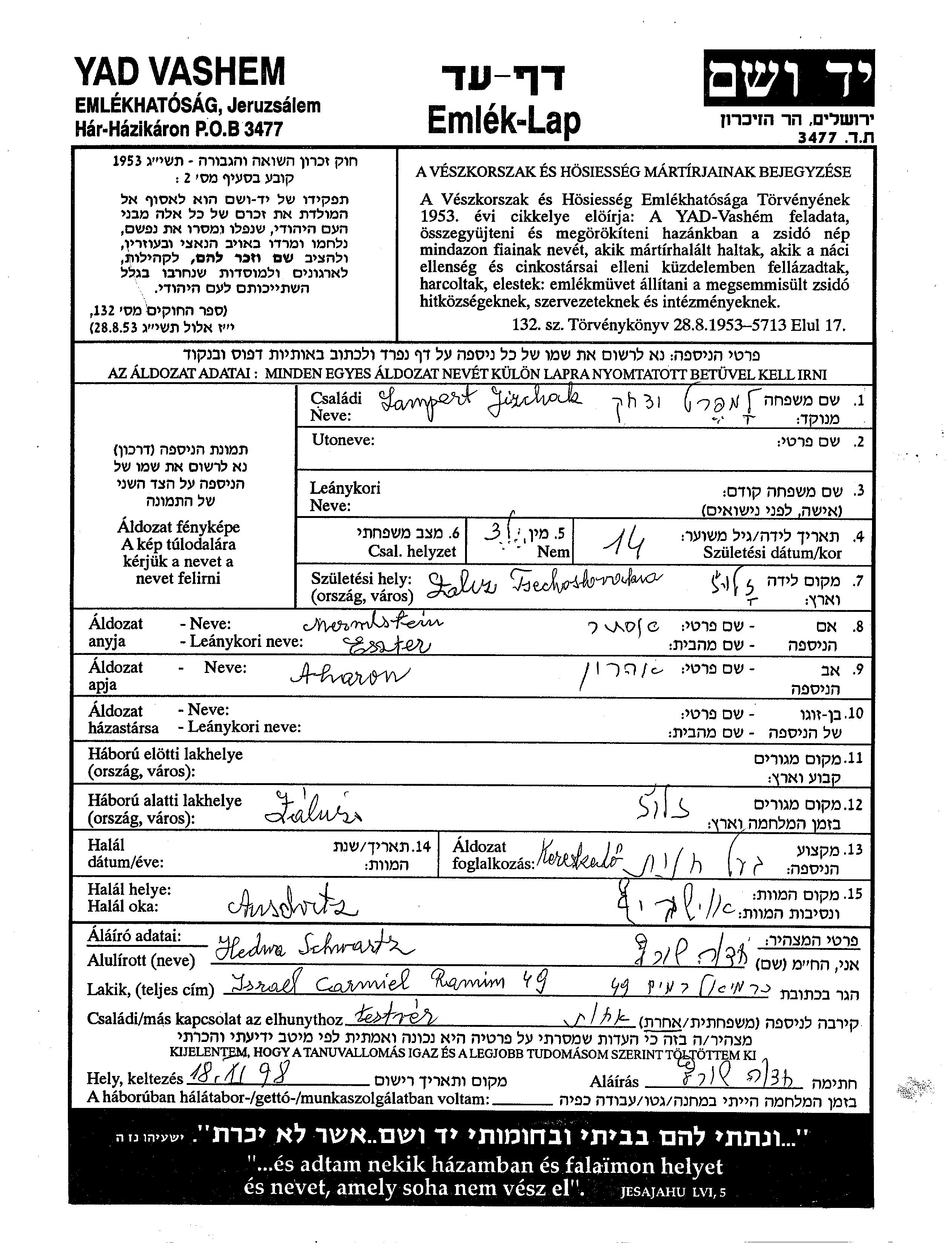 Yitzkhak Lampert wurde in Zaluz, Tschechoslowakei geboren. Er war der Sohn von Aharon und Eszter. Er war Ladenbesitzer/-in und Kind. Vor dem Zweiten Weltkrieg lebte er in Zaluz, Tschechoslowakei. Während des Krieges war er in Zaluz, Tschechoslowakei.