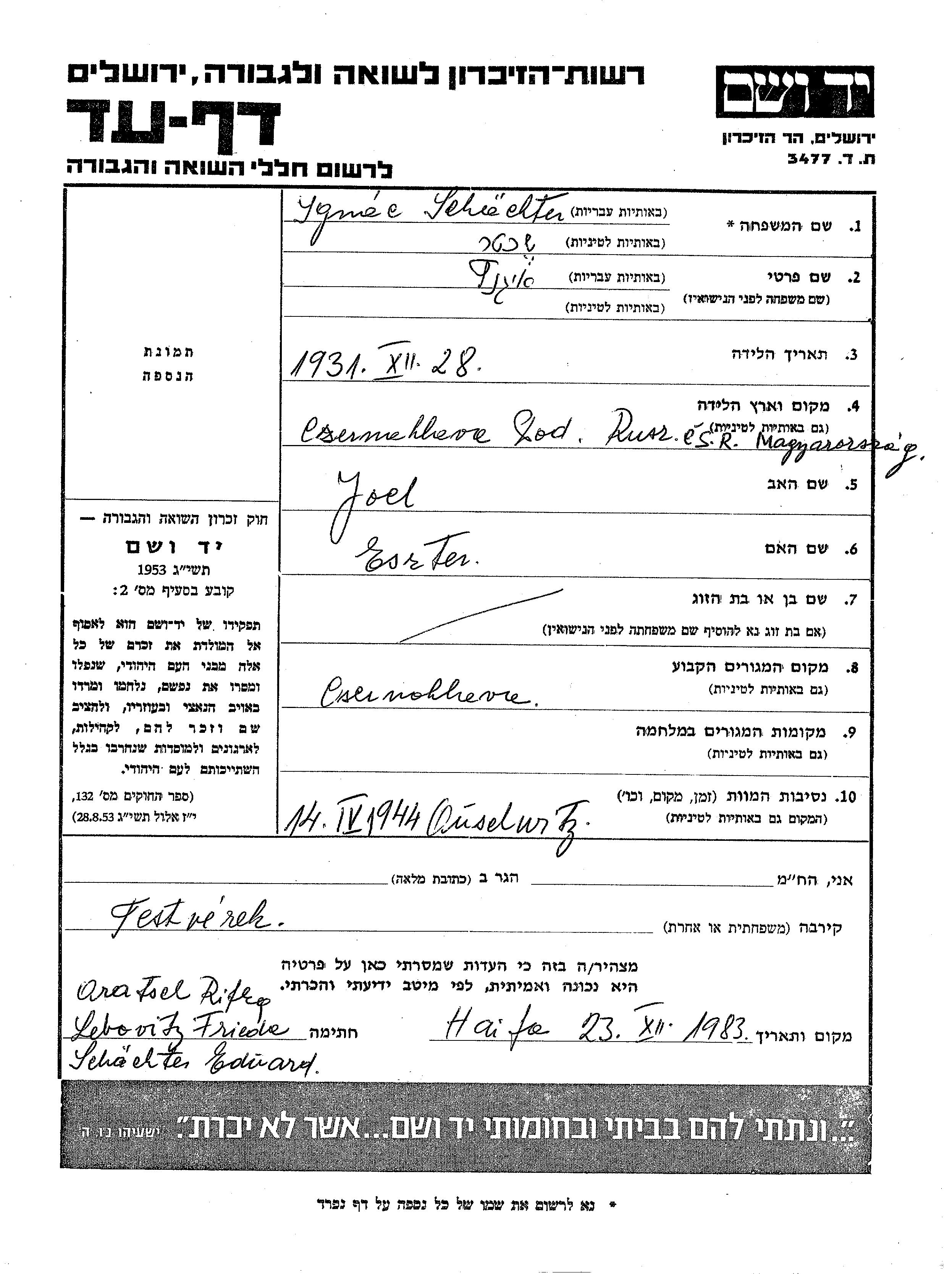 Ignac Schachter wurde im Jahr 1931 in Csernoholova, Tschechoslowakei geboren. Er war der Sohn von Joel und Ester. Vor dem Zweiten Weltkrieg lebte er in Csernoholova, Tschechoslowakei.