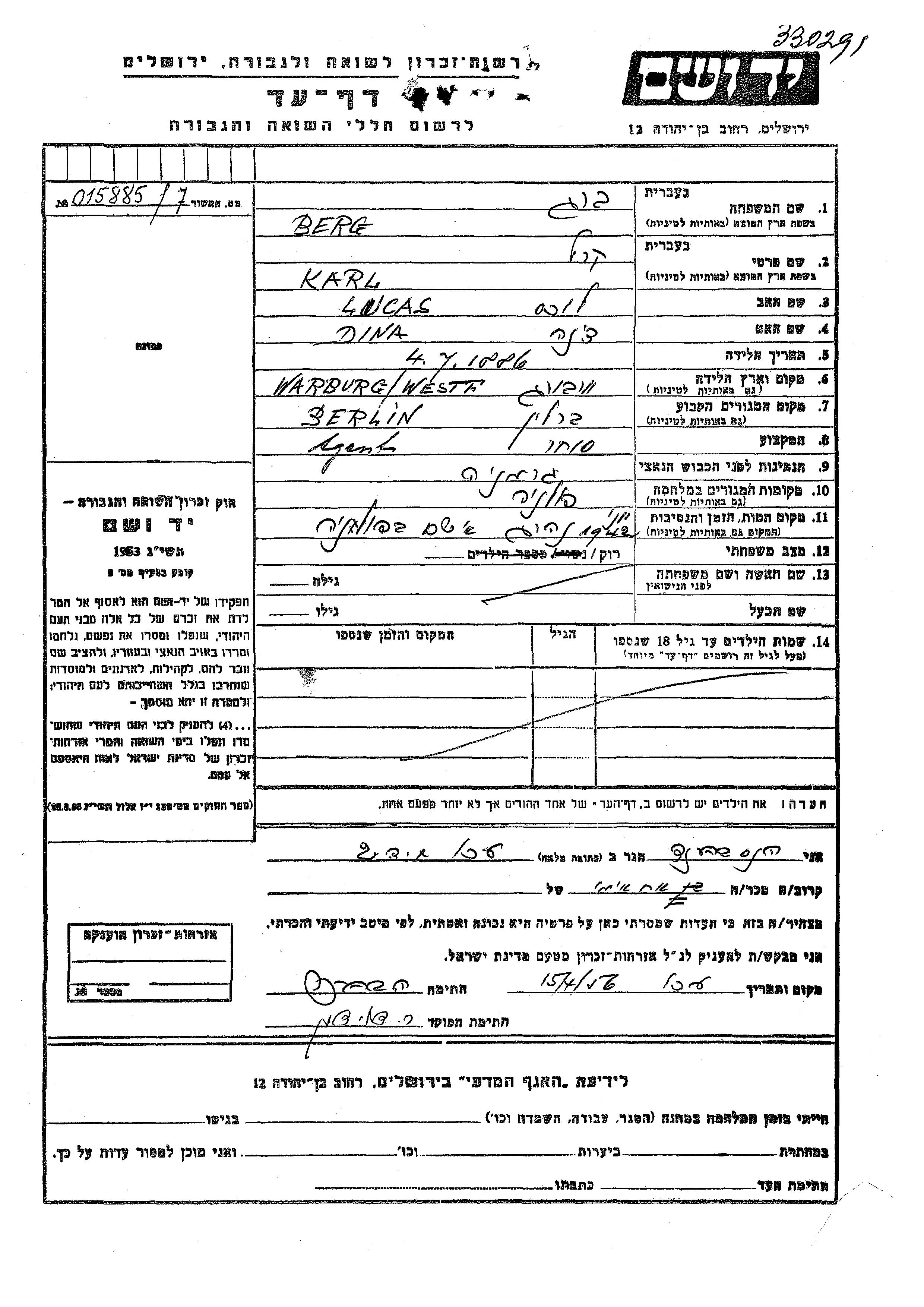 Karl Berg wurde im Jahr 1886 in Warburg, Deutsches Reich geboren. Er war der Sohn von Lucas und Dina. Er war Kaufmann/-frau und Ledig. Vor dem Zweiten Weltkrieg lebte er in Berlin, Deutsches Reich. Während des Krieges war er in Polen.