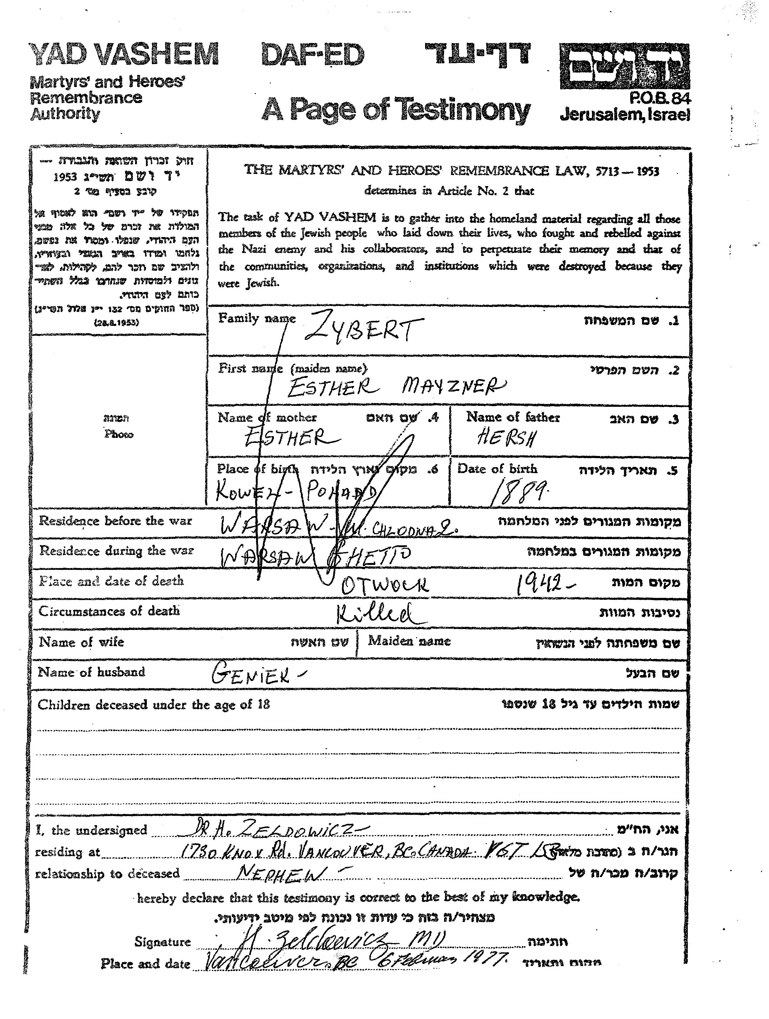 Esther Zybert, geb. Mayzner wurde im Jahr 1889 in Kowel, Polen geboren. Sie war die Tochter von Hersh und Esther. Sie war mit Geniek Verheiratet. Vor dem Zweiten Weltkrieg lebte sie in Warsaw, Polen. Während des Krieges war sie in Warsaw, Polen.