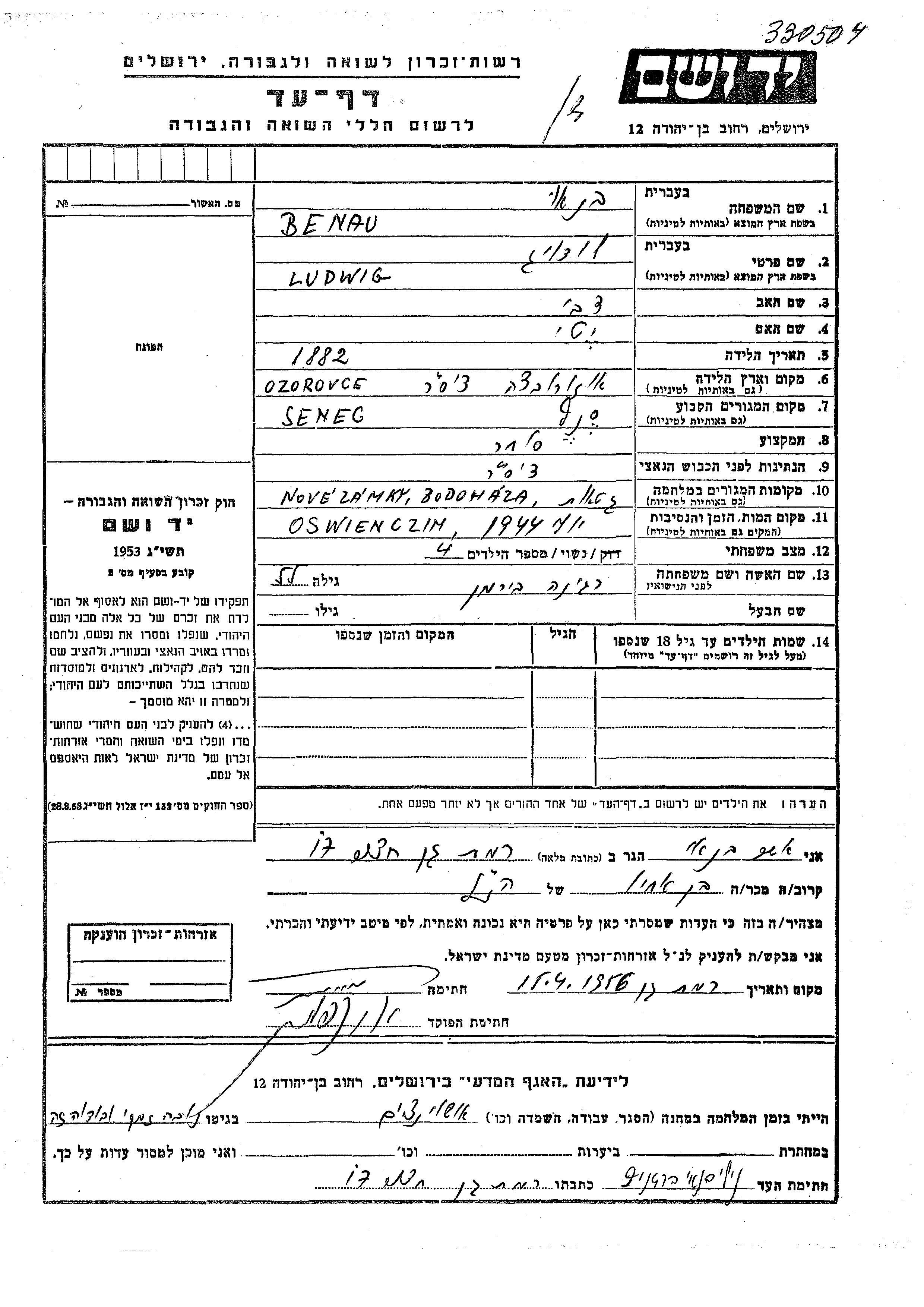 Ludwig Benau wurde im Jahr 1882 in Ozorovce, Tschechoslowakei geboren. Er war der Sohn von Tzvi und Yehudit. Er war Kaufmann/-frau und mit Regina, geb. Birman Verheiratet. Vor dem Zweiten Weltkrieg lebte er in Senec, Tschechoslowakei. Während des Krieges war er in Nove Zamky, Tschechoslowakei.
