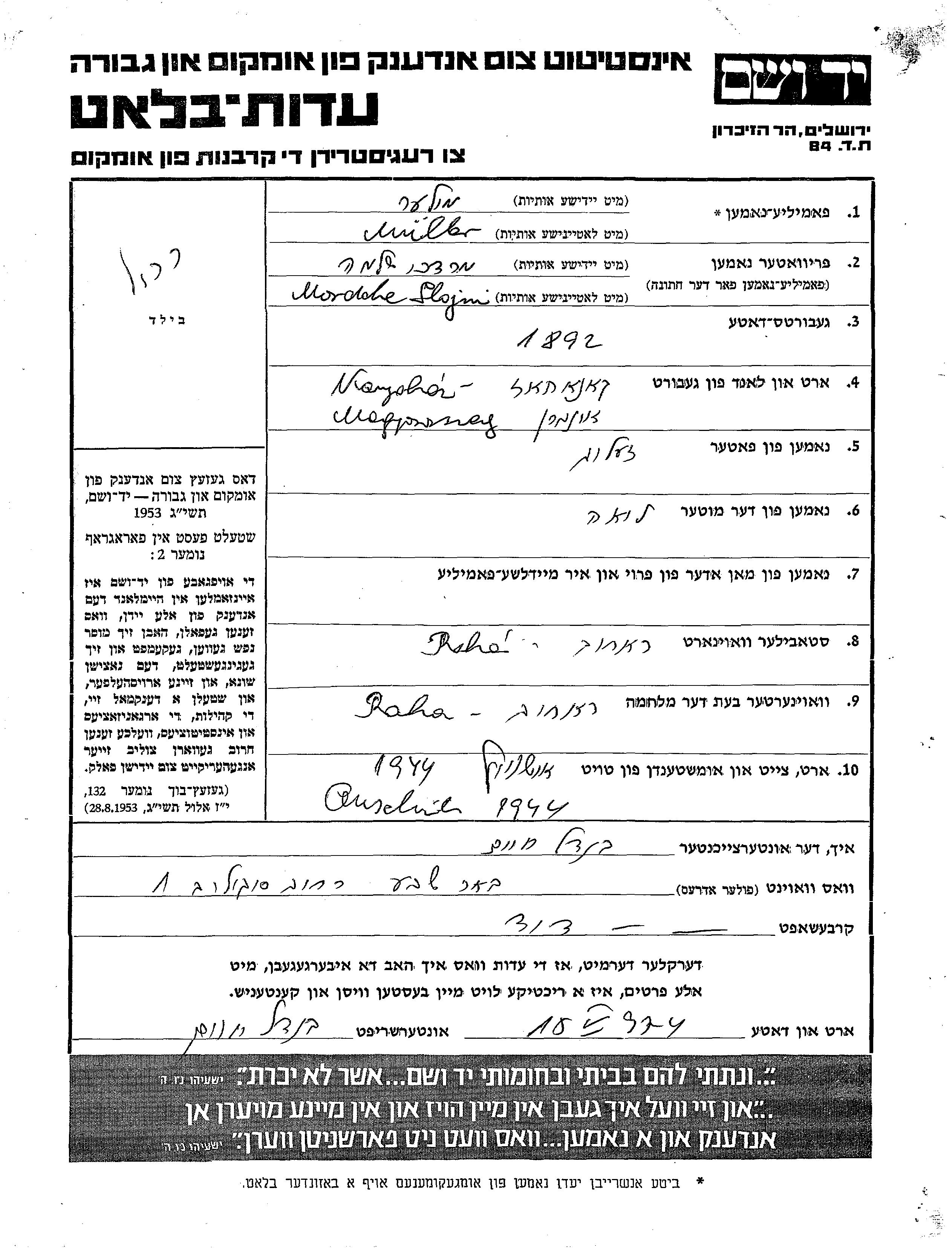 Miler Slojmi Mordekhai 1892 Rachov, Tschechoslowakei Gedenkblatt