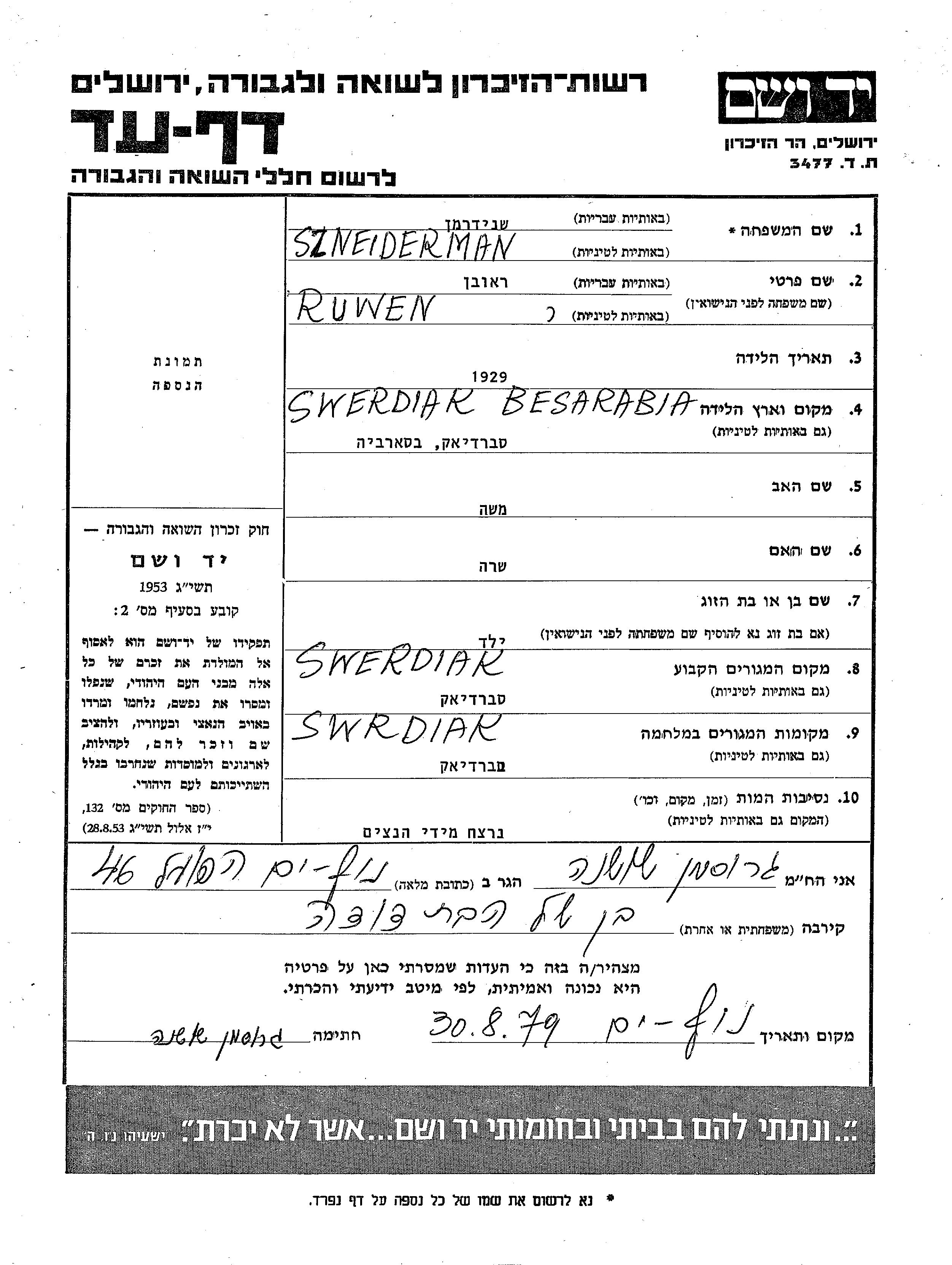 Ruwen Szneiderman wurde im Jahr 1929 in Sverdiac, Rumänien geboren. Er war der Sohn von Moshe und Sara. Er war Ledig. Vor dem Zweiten Weltkrieg lebte er in Sverdiac, Rumänien. Während des Krieges war er in Sverdiac, Rumänien.