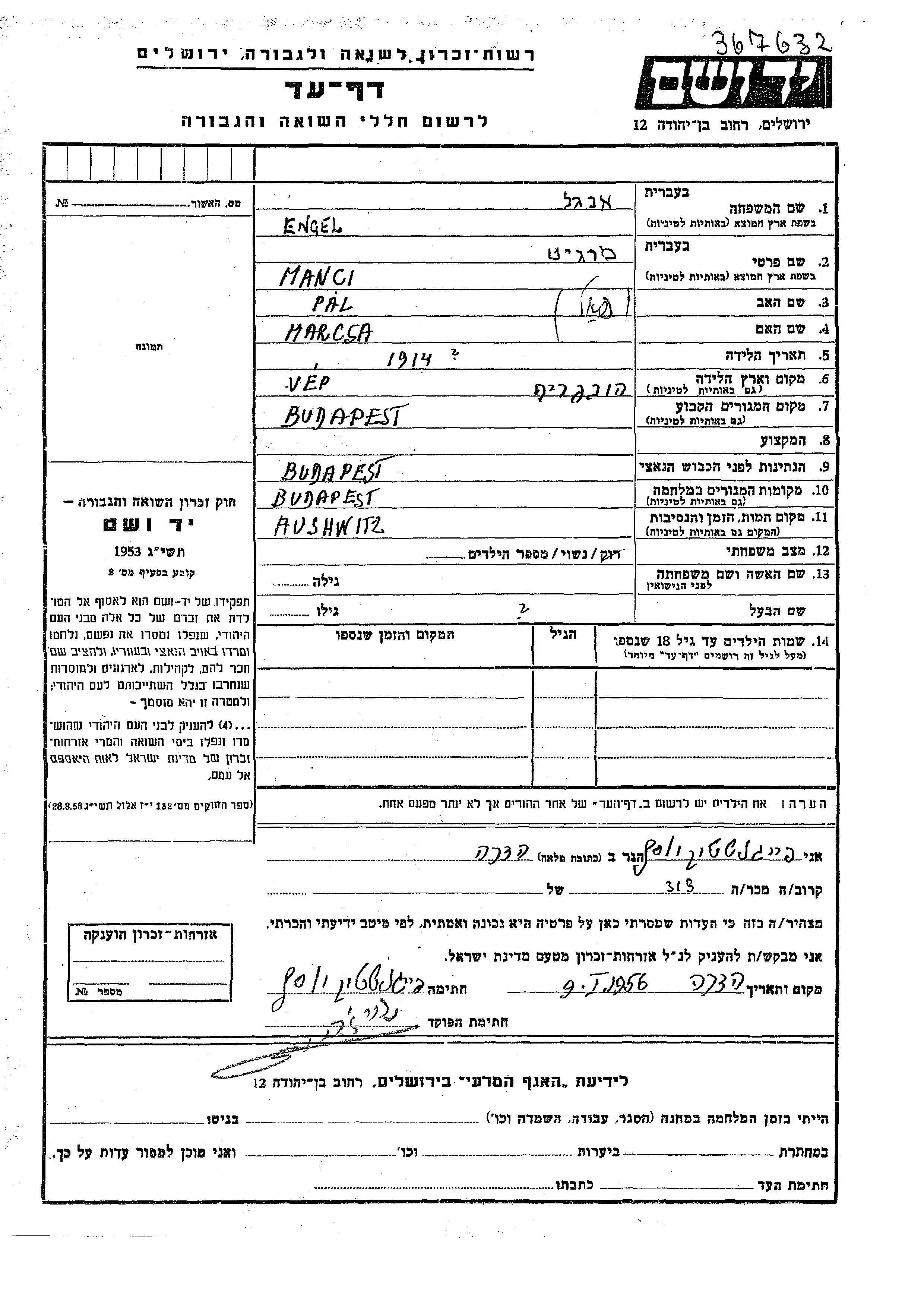 Manci Margit Engel wurde im Jahr 1914 in Vep, Ungarn geboren. Sie war die Tochter von Pal und Marcsa. Sie war Verheiratet. Vor dem Zweiten Weltkrieg lebte sie in Budapest, Ungarn. Während des Krieges war sie in Budapest, Ungarn.