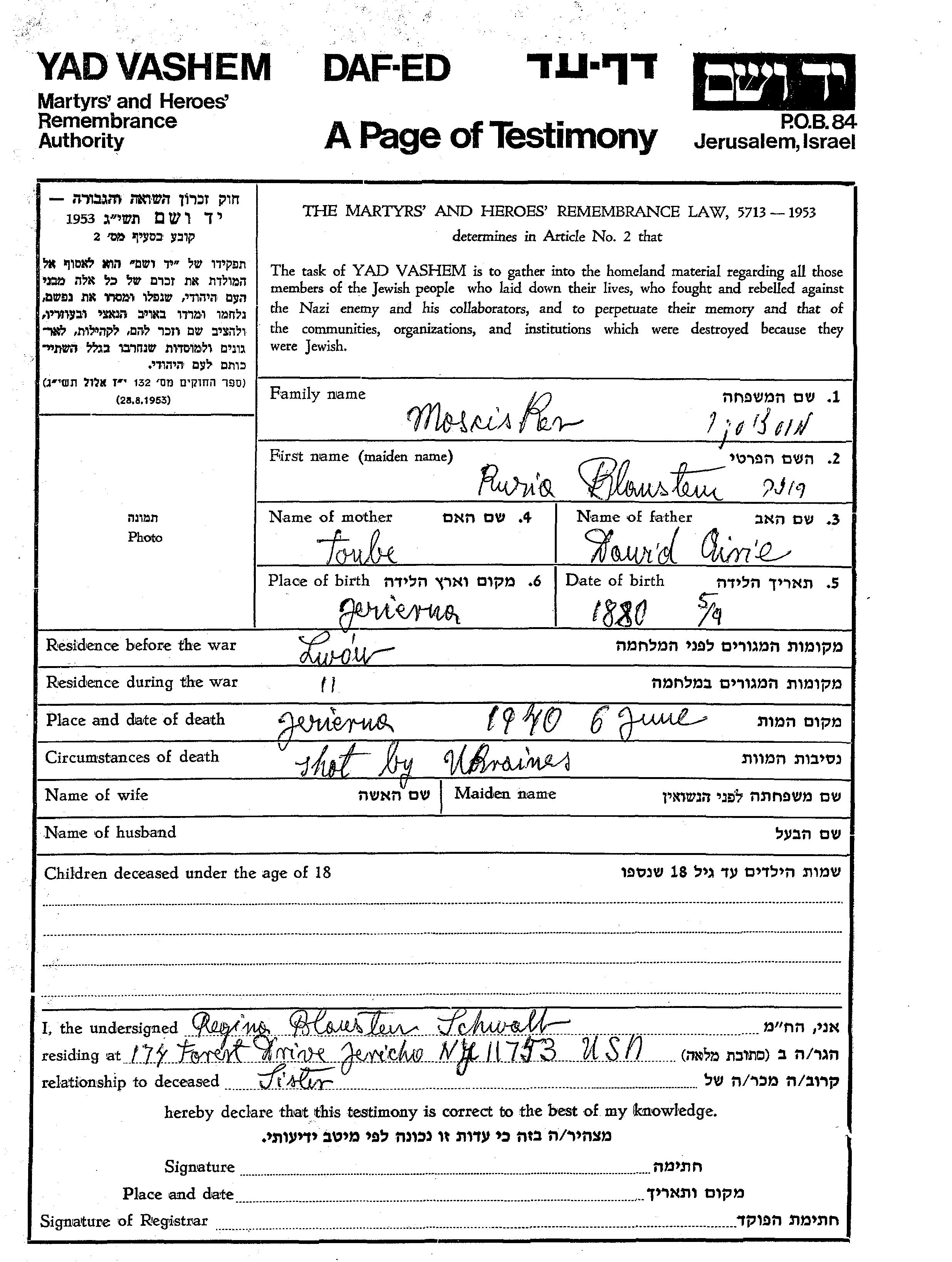 Ruzia Moscisker wurde im Jahr 1880 in Jezierna, Polen geboren. Sie war die Tochter von Dawid Airie und Toube. Vor dem Zweiten Weltkrieg lebte sie in Lwow, Polen. Während des Krieges war sie in Lwow, Polen.