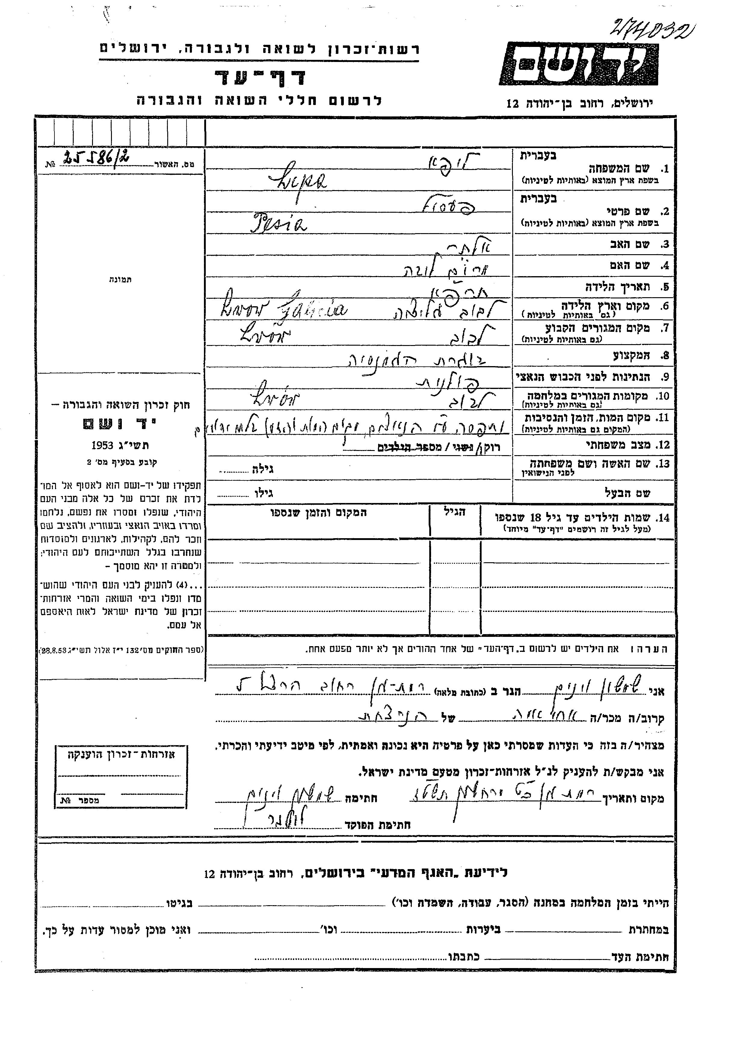 Pesil Lipa wurde im Jahr 1921 in Lwow, Polen geboren. Sie war die Tochter von Alter und Miriam Luba. Sie war Gymnasialabsolvent und Ledig. Vor dem Zweiten Weltkrieg lebte sie in Lwow, Polen. Während des Krieges war sie in Lwow, Polen.