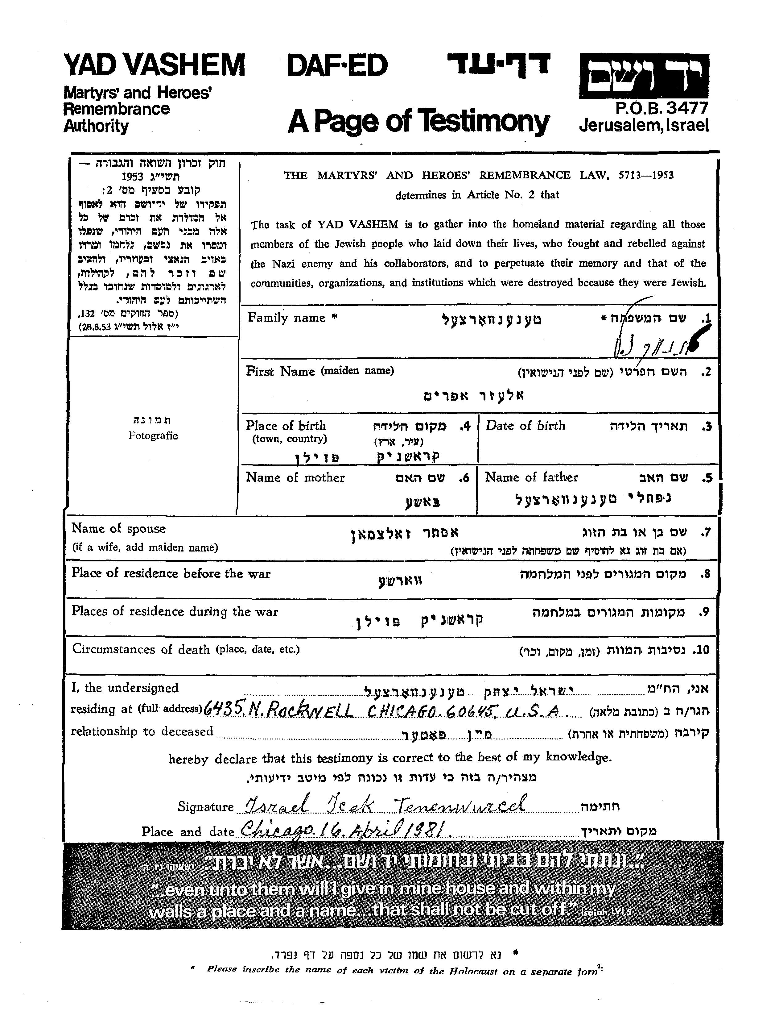 Elazar Efraim Tenenvortzel wurde in Krashnik, Polen geboren. Er war der Sohn von Naftali und Bashe. Vor dem Zweiten Weltkrieg lebte er in Varsha, Polen. Während des Krieges war er in Krashnik, Polen.