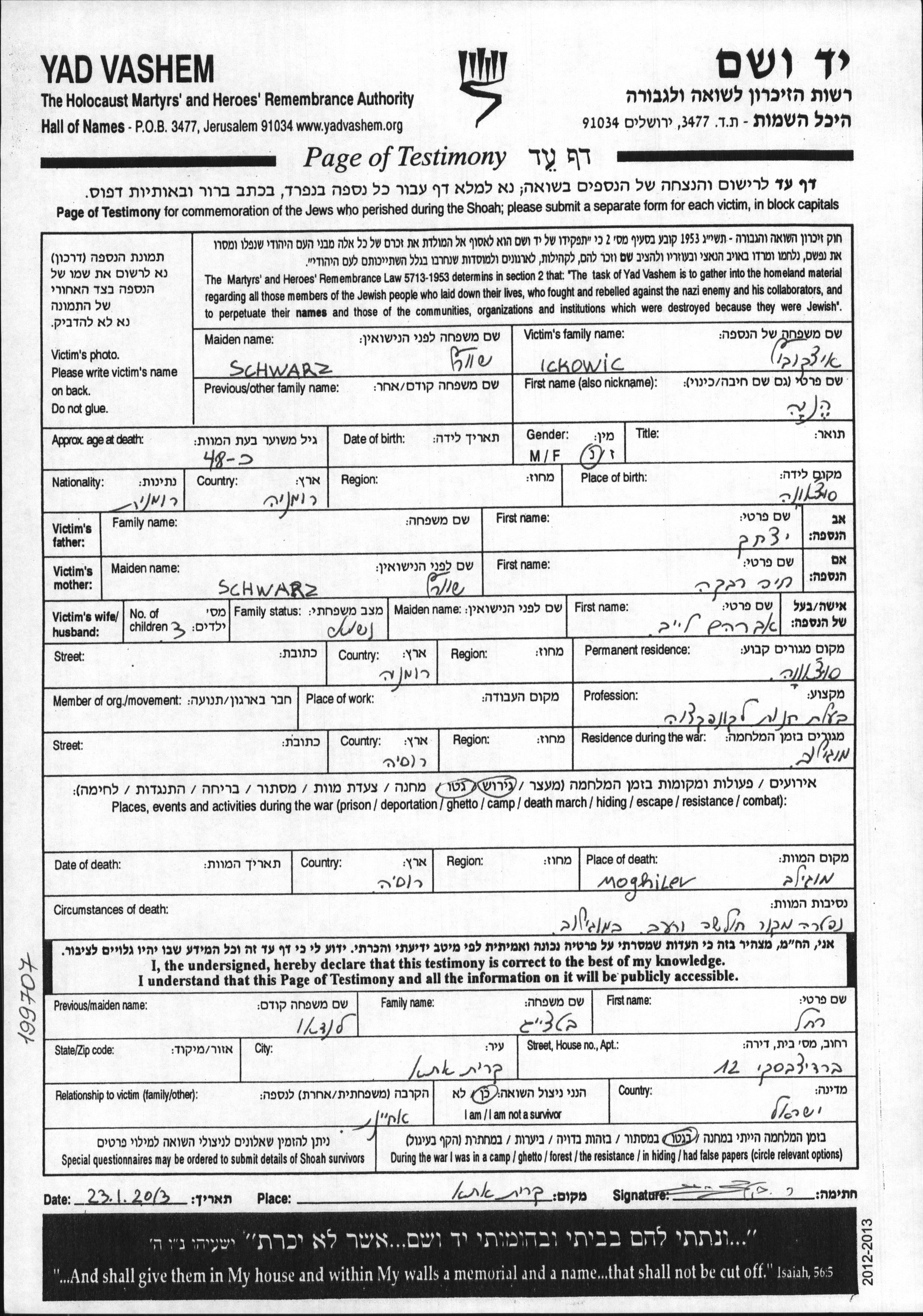 Henia Ickowic, geb. Schwarz wurde im Jahr 1898 in Suceava, Rumänien geboren. Sie war Kaufmann/-frau. Vor dem Zweiten Weltkrieg lebte sie in Suceava, Rumänien.