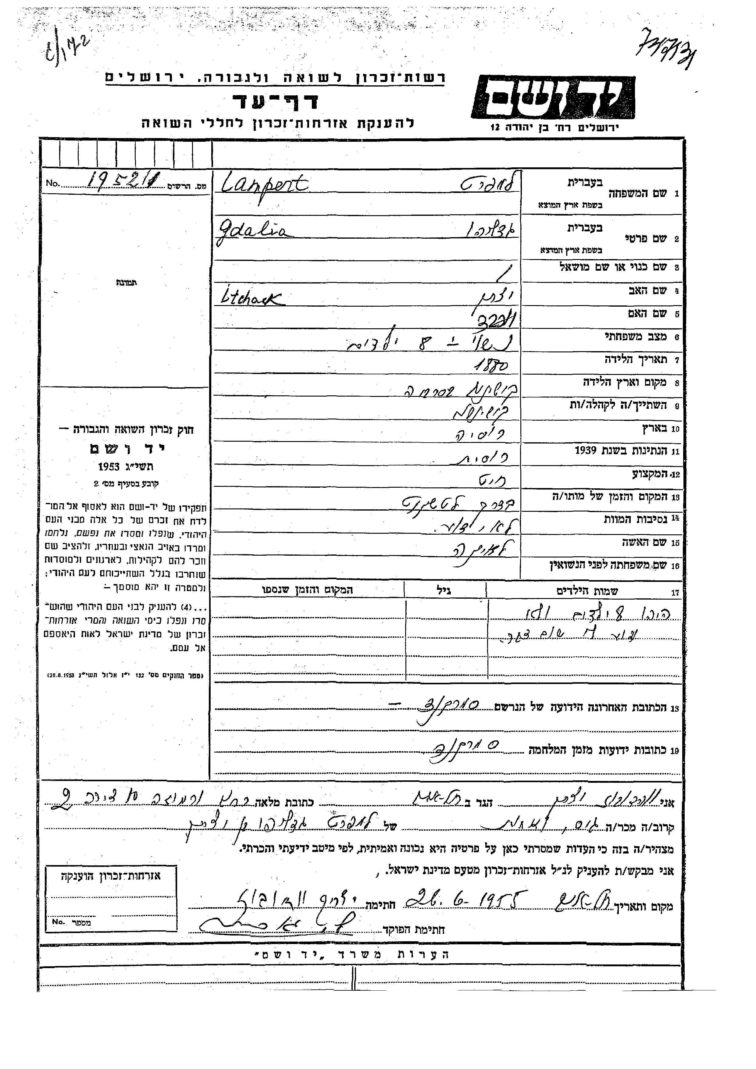 Gdalia Lampert wurde im Jahr 1880 in Kishinev, Rumänien geboren. Er war der Sohn von Itchack und Yokheved. Er war Schneider und mit Lea Verheiratet. Vor dem Zweiten Weltkrieg lebte er in Kishinev, Rumänien.