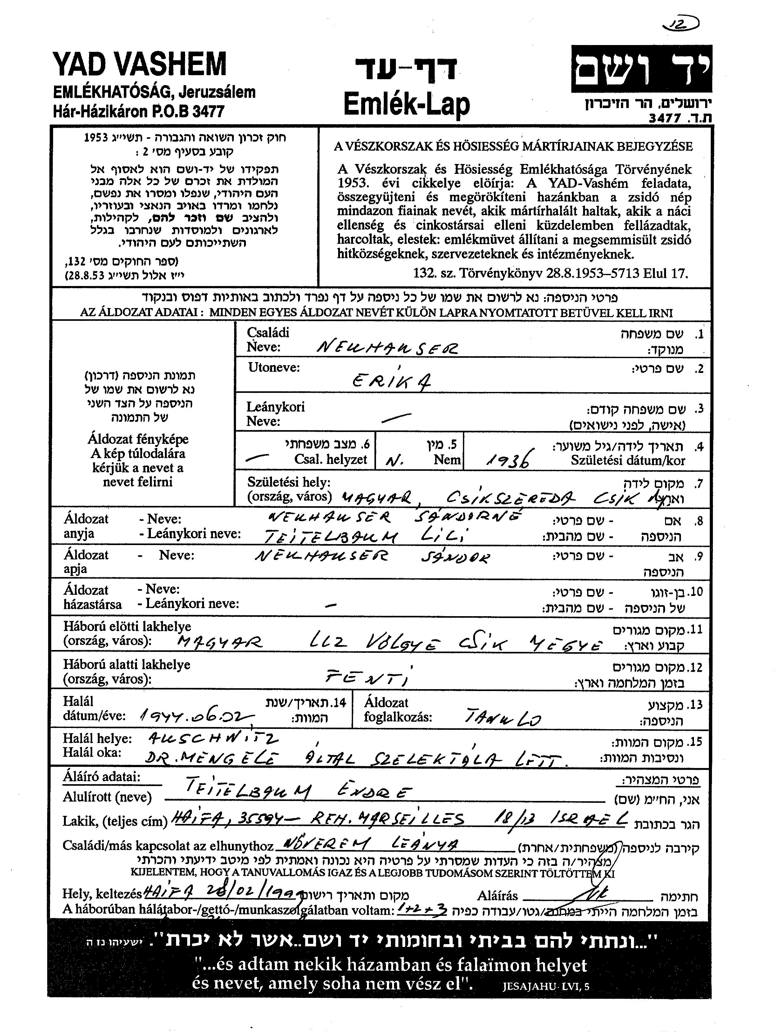 Erika Neuhauser wurde im Jahr 1936 in Magyar Gyanta, Rumänien geboren. Sie war die Tochter von Sandor und Sandorne Lili. Vor dem Zweiten Weltkrieg lebte sie in Magyar Gyanta, Rumänien. Während des Krieges war sie in Fentos, Rumänien.