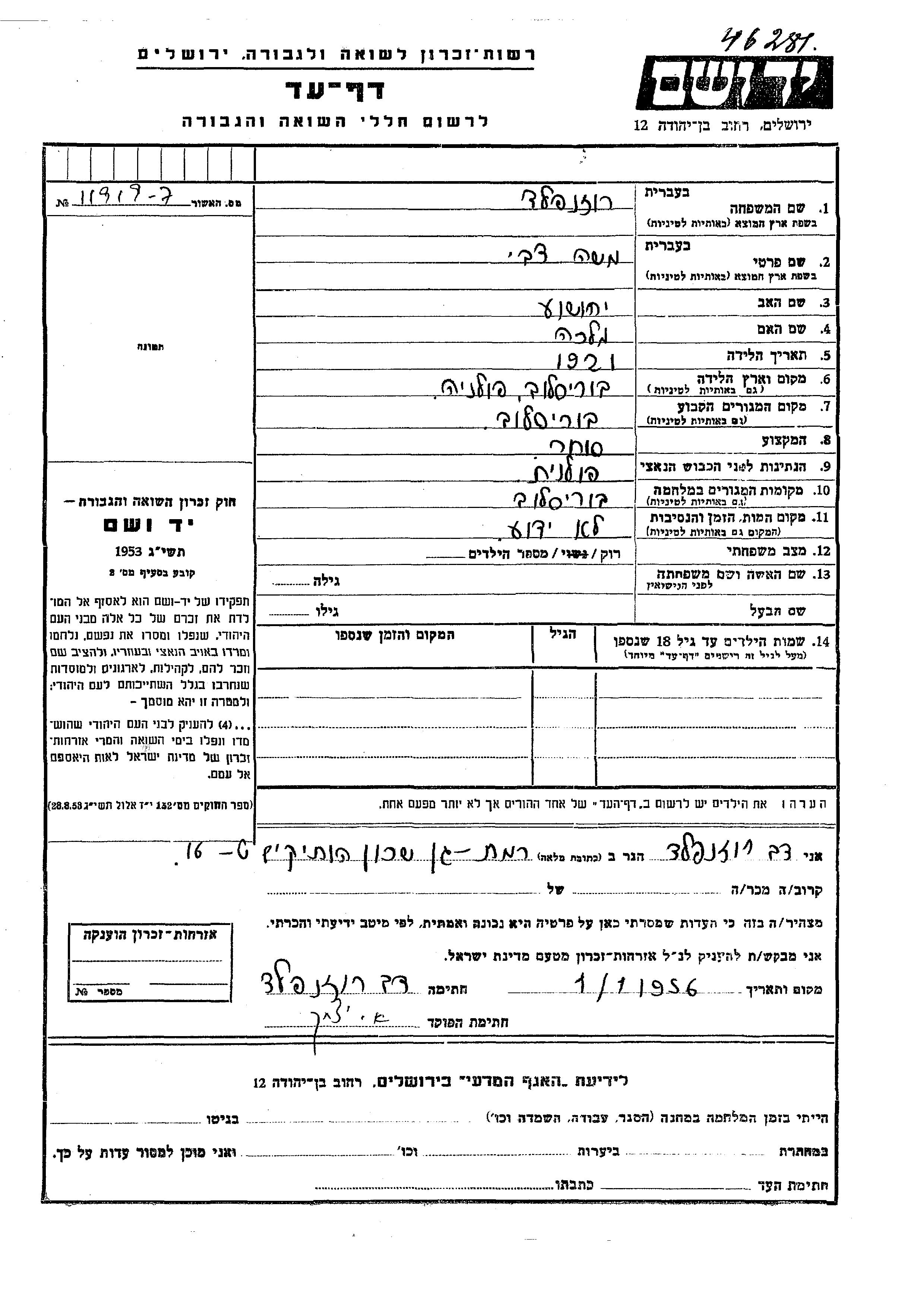 Rozenfeld Moshe Tzvi 1921 Boryslaw, Polen Gedenkblatt