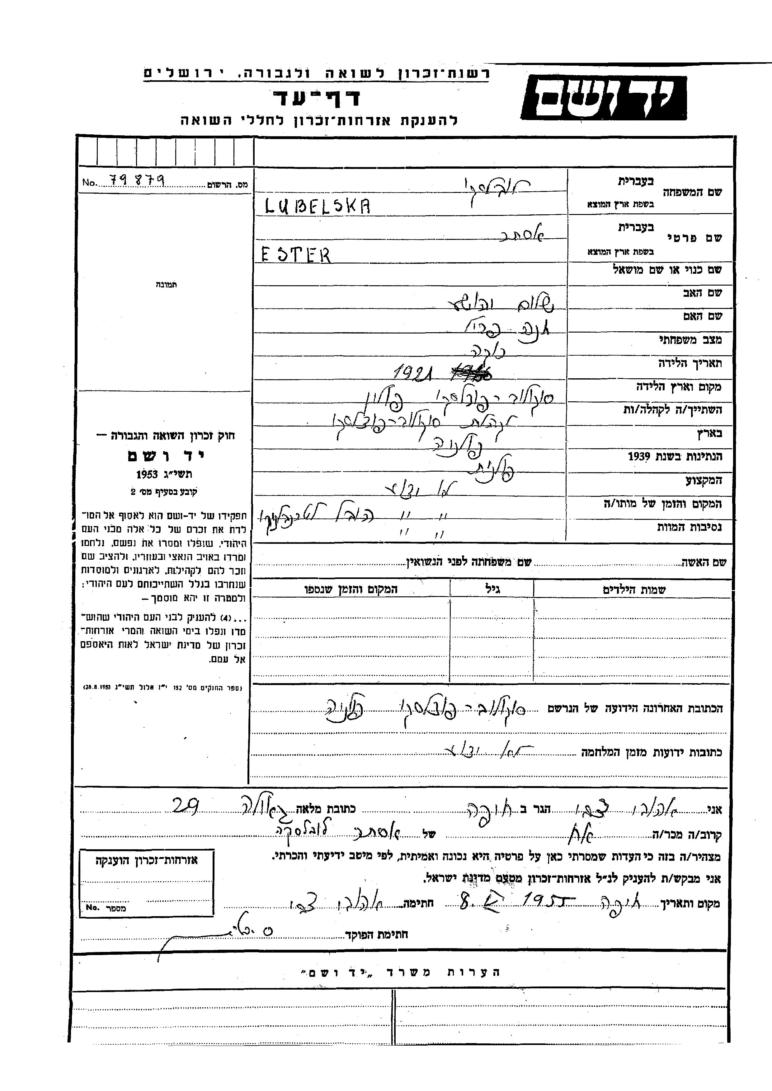 Ester Lubelska wurde im Jahr 1921 in Sokolow Podlaski, Polen geboren. Sie war die Tochter von Shalom Yehoshua und Ana Peril. Sie war Ledig. Vor dem Zweiten Weltkrieg lebte sie in Sokolow Podlaski, Polen.