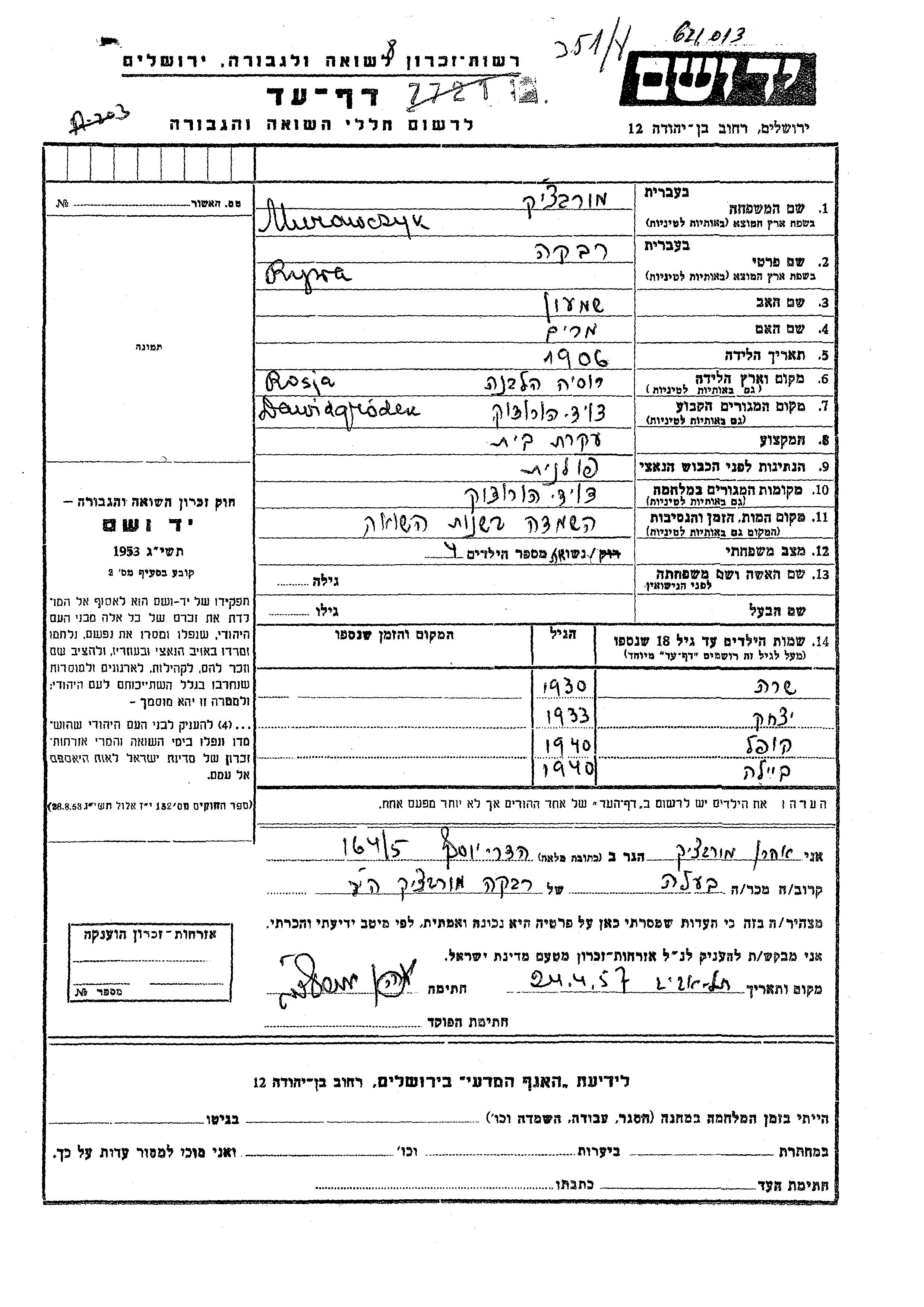 Rywa Murawczyk wurde im Jahr 1906 in Weißrussland (UdSSR) geboren. Sie war die Tochter von Shimon und Miriam. Sie war Hausfrau und Verheiratet. Vor dem Zweiten Weltkrieg lebte sie in Dawid Grodek, Polen. Während des Krieges war sie in Dawid Grodek, Polen.