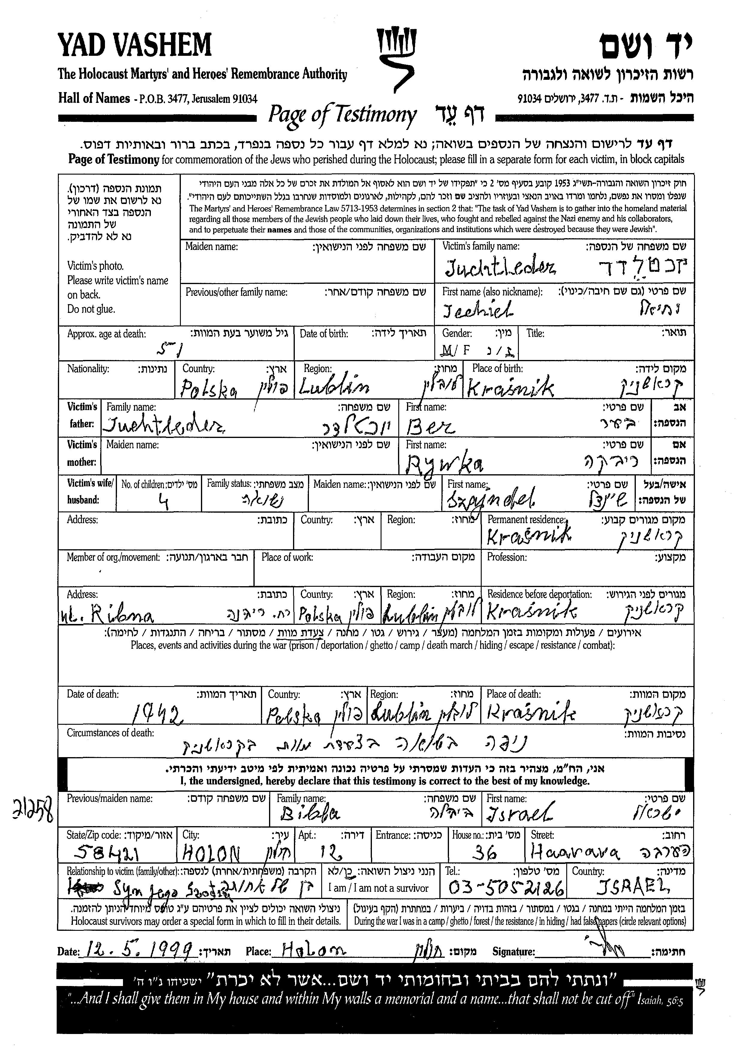Iukhtleder Yekhiel Krasnik, Polen Aufzeichnungen ueber ermordete Personen