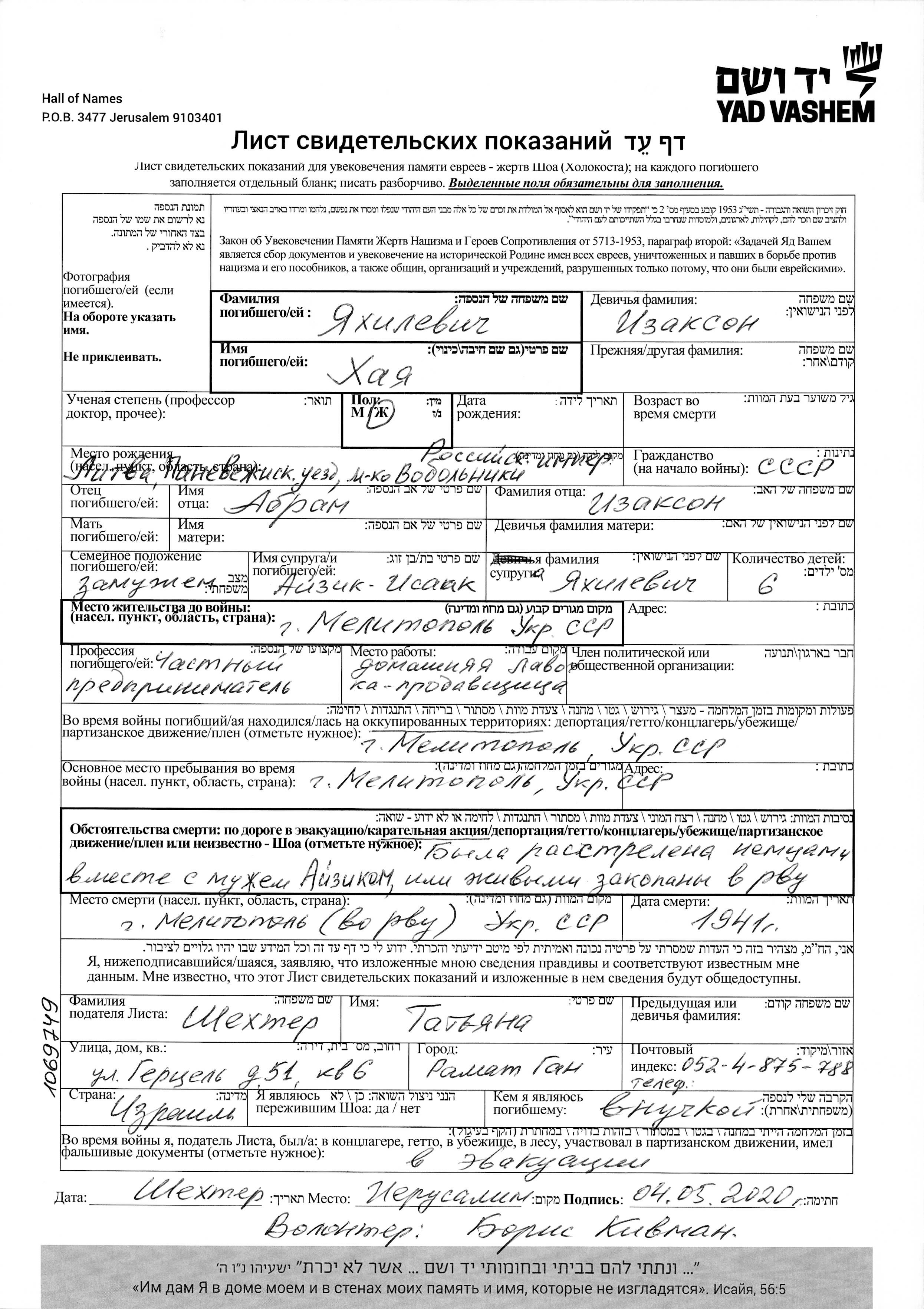 Khaya Yakhilevich, geb. Izakson wurde in Vobolniki, Litauen geboren. Sie war die Tochter von Abram. Sie war Selbständig und mit Ayzik Verheiratet. Vor dem Zweiten Weltkrieg lebte sie in Melitopol, Ukraine (UdSSR). Während des Krieges war sie in Melitopol, Ukraine (UdSSR).