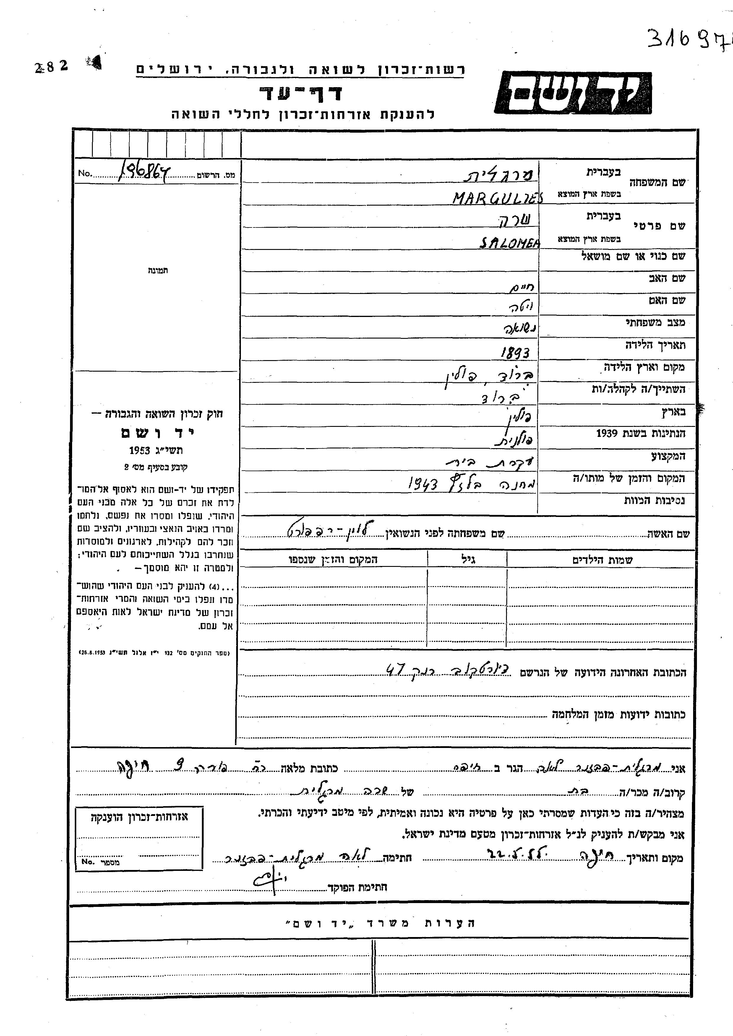 Salomea Sara Margulies, geb. Levin wurde im Jahr 1893 in Brod, Polen geboren. Sie war die Tochter von Khaim und Vita. Sie war Hausfrau und Verheiratet. Vor dem Zweiten Weltkrieg lebte sie in Brod, Polen. Während des Krieges war sie in Czortkow, Polen.