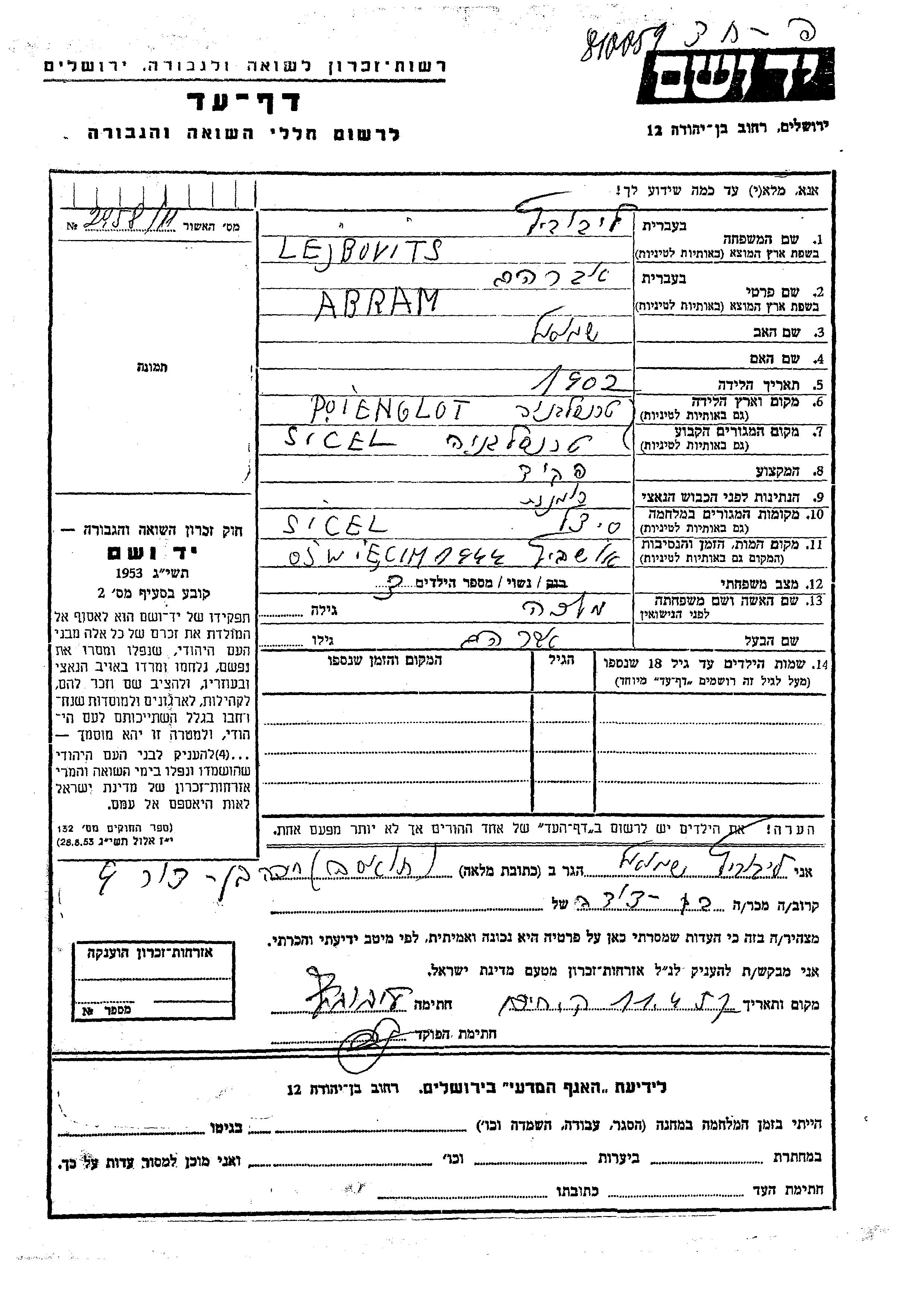 Lejbovits Abram 1902 Sicel, Rumänien Gedenkblatt