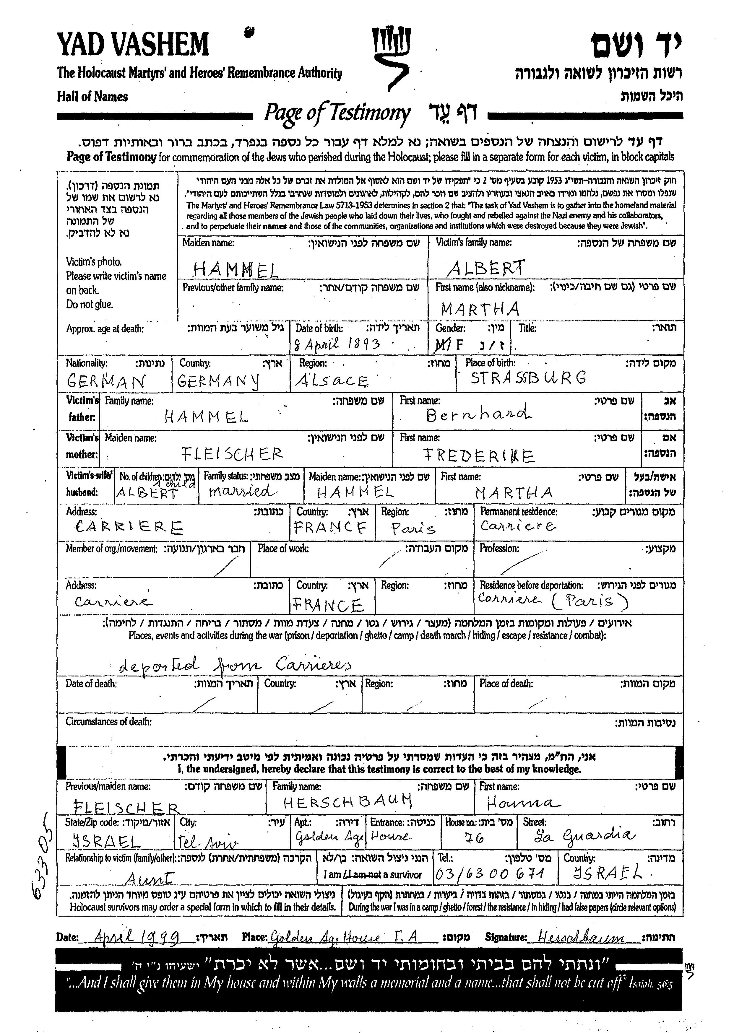 Marta Albert Elbert, geb. Hammel wurde im Jahr 1893 in Strasbourg, Frankreich geboren. Vor dem Zweiten Weltkrieg lebte sie in Carrieres, Frankreich.