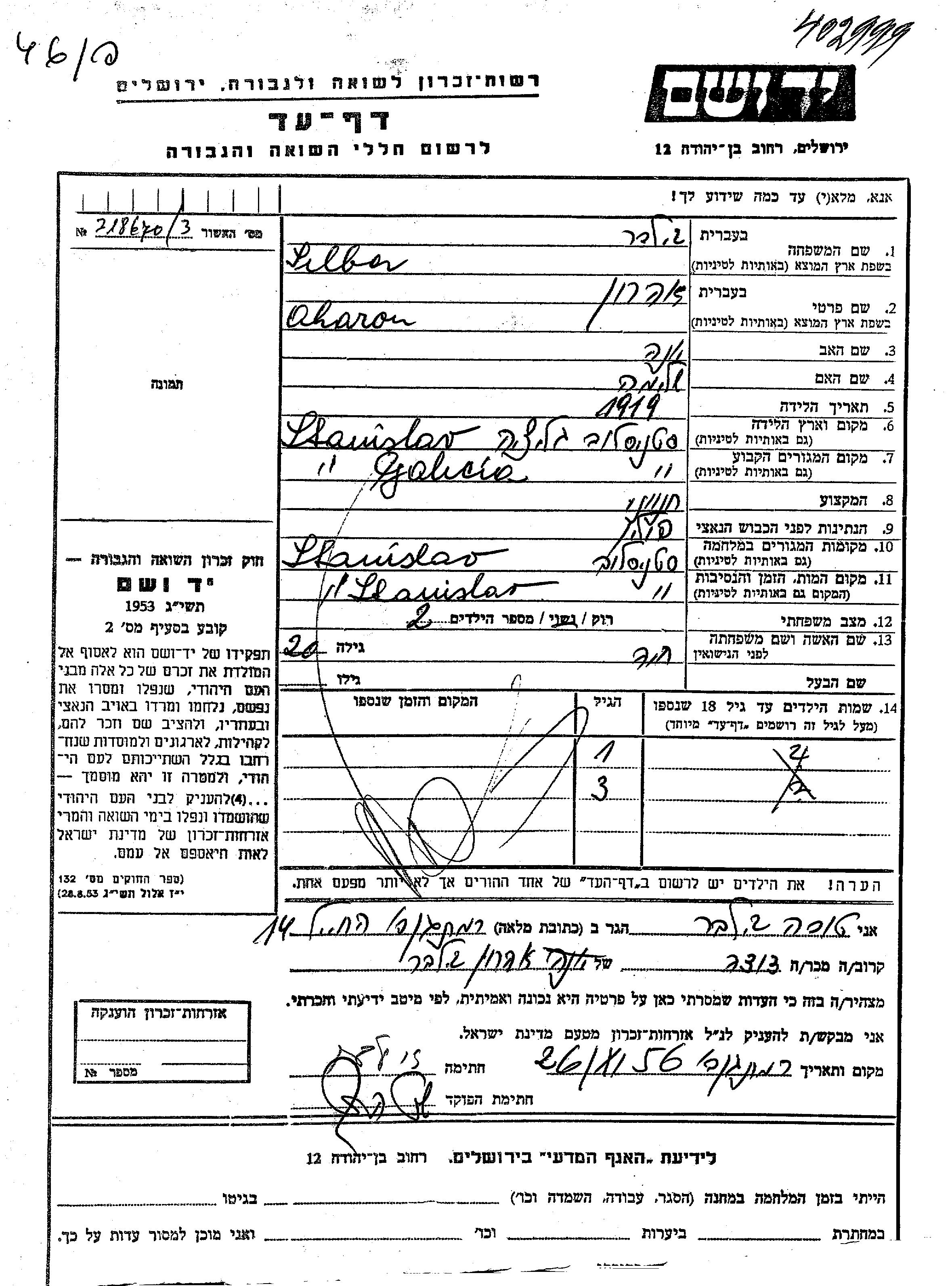Aharon wurde in der Schoah ermordet. Todesort: Stanislawow, Polen.