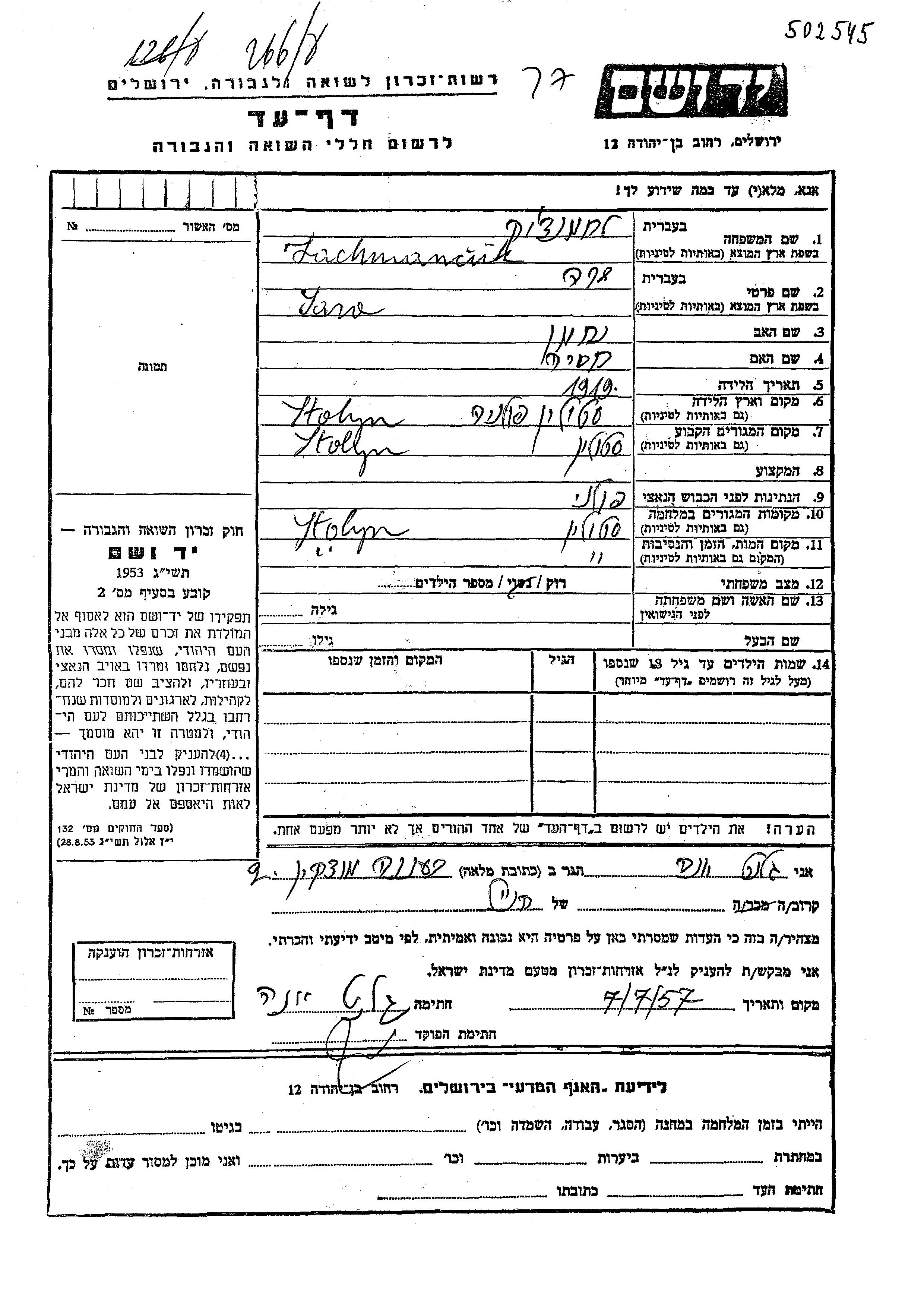 Lachmancuk Sara 1919 Stolin, Polen Gedenkblatt