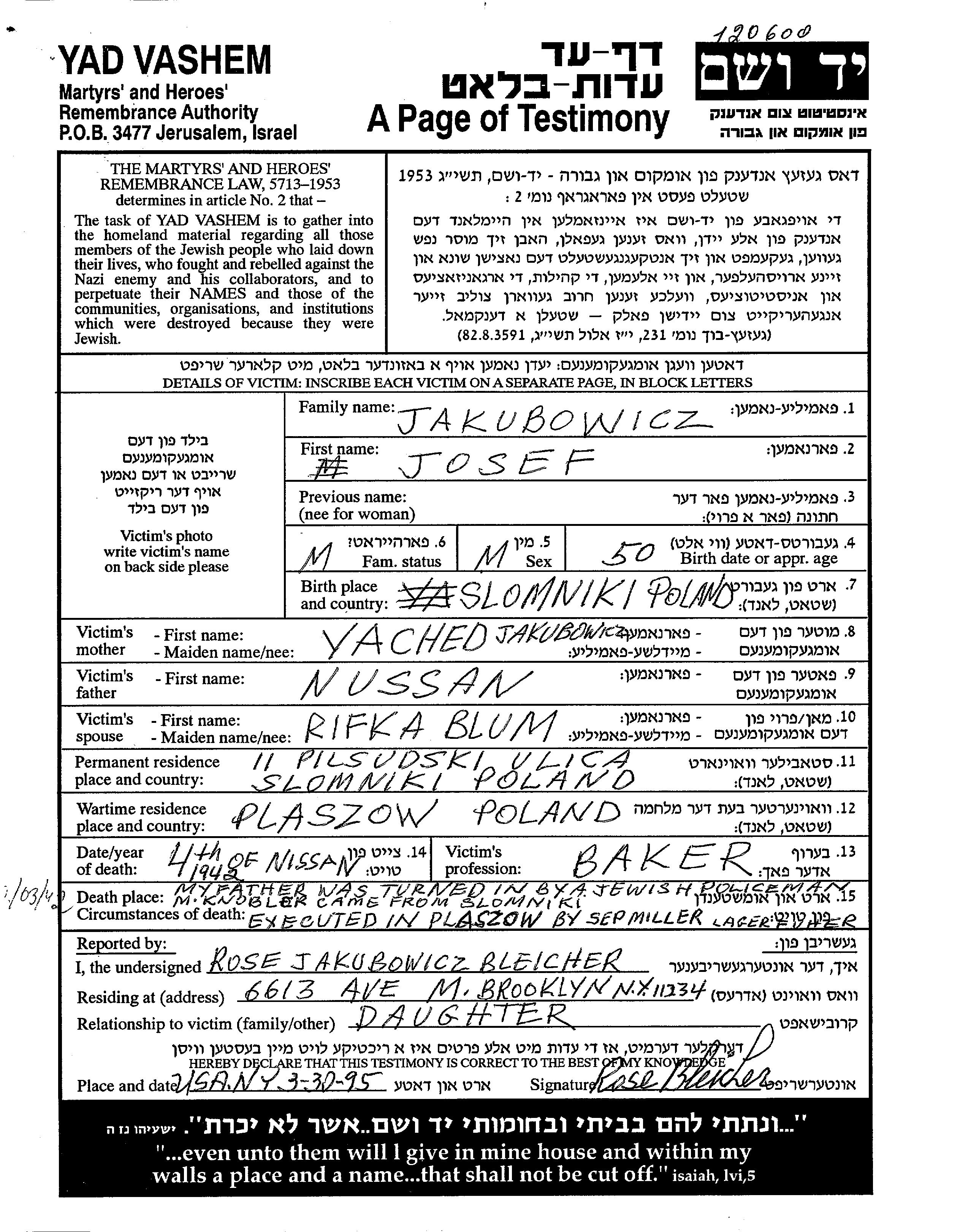 Jakubowicz Bleicher Rose Slomniki, Polen Gedenkblatt