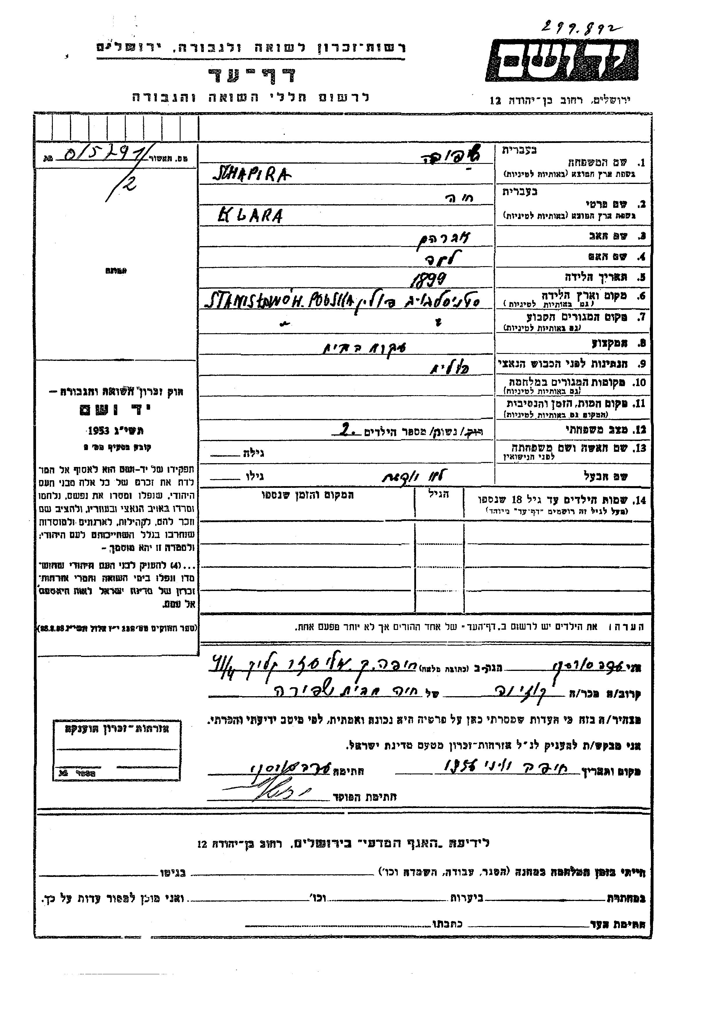Klara Khaia Schapira wurde im Jahr 1890 in Stanislawow, Polen geboren. Sie war die Tochter von Avraham und Lea. Sie war Hausfrau und Verheiratet. Vor dem Zweiten Weltkrieg lebte sie in Stanislawow, Polen.
