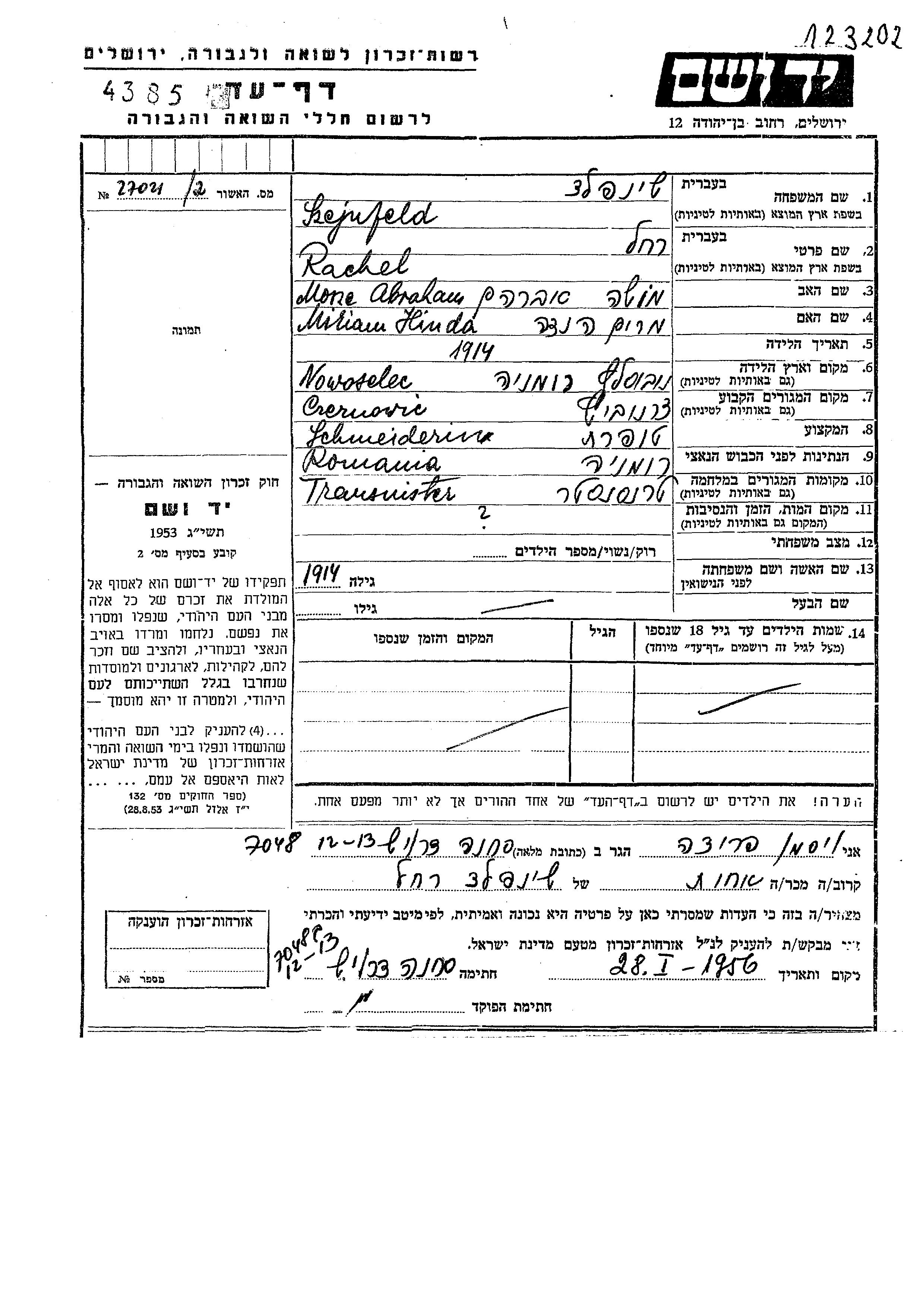 Rachel Szejnfeld wurde im Jahr 1914 in Novoselic, Rumänien geboren. Sie war die Tochter von Mosze Abraham und Miriam Hinda. Sie war Schneiderin und Ledig. Vor dem Zweiten Weltkrieg lebte sie in Czernowitz, Rumänien. Während des Krieges war sie in Transnistria, Ukraine (UdSSR).