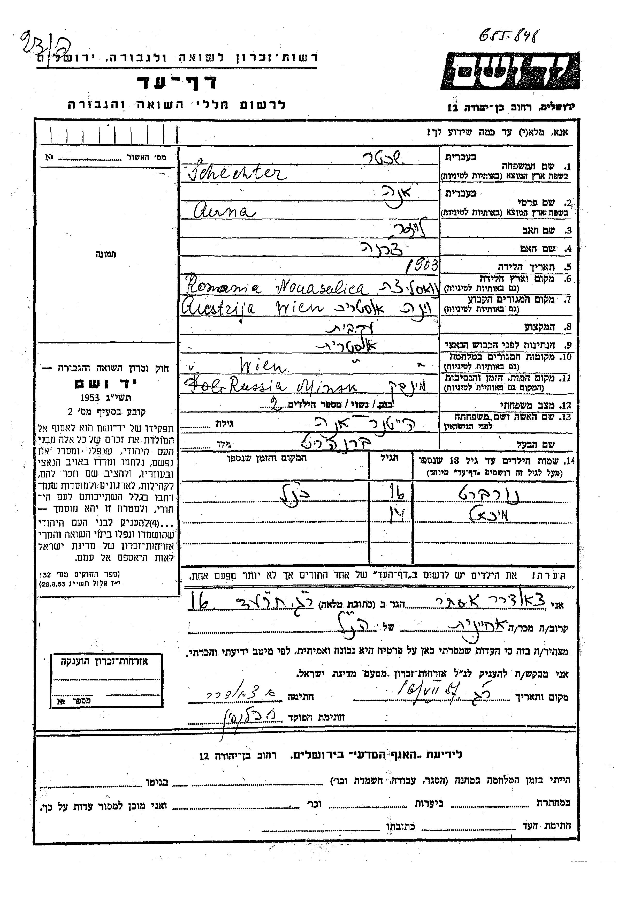 Anna Schechter, geb. Heitner wurde im Jahr 1903 in Noua Sulica, Rumänien geboren. Sie war die Tochter von Leizer und Charna. Sie war Hausfrau und mit Bernhart Verheiratet. Vor dem Zweiten Weltkrieg lebte sie in Vienna, Österreich. Während des Krieges war sie in Vienna, Österreich.