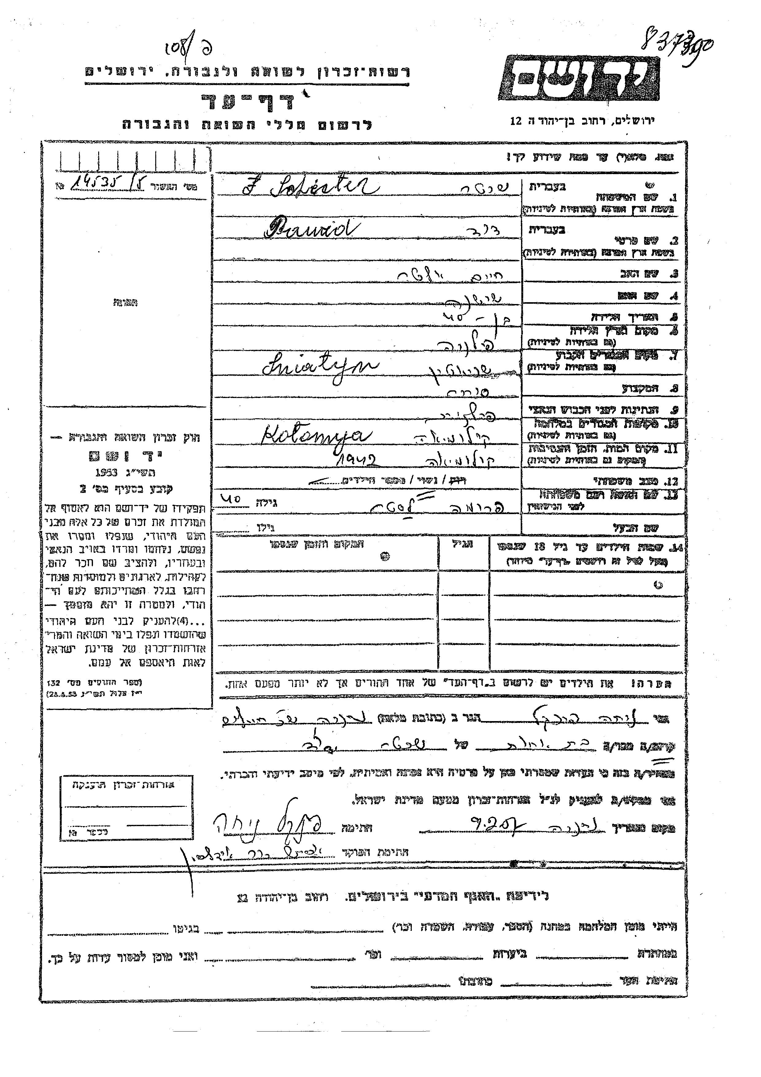 Dawid wurde in der Schoah ermordet. Todesort: Kolomyia, Polen im Jahr 1942.