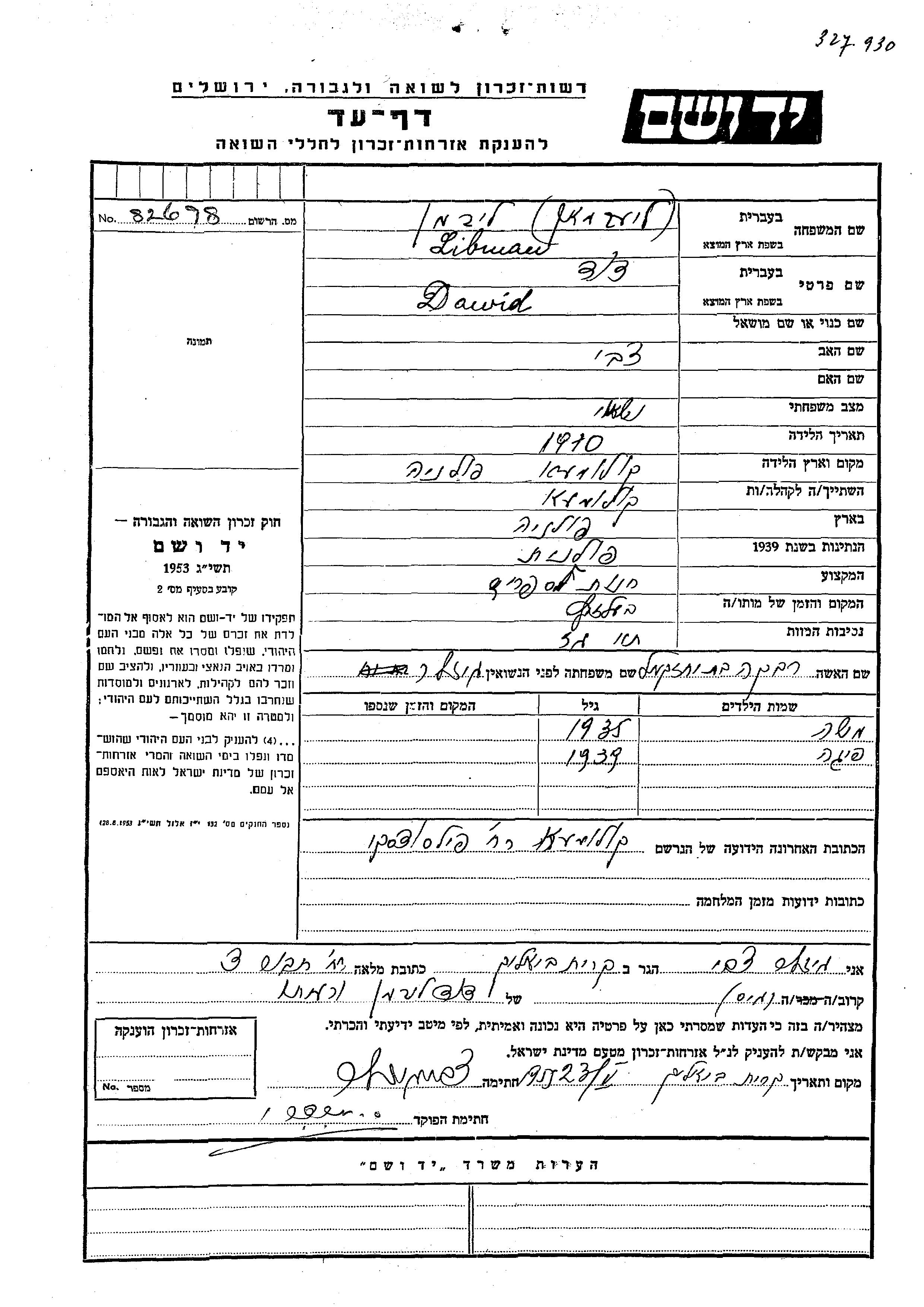 Dawid Libman wurde im Jahr 1910 in Kolomyja, Polen geboren. Er war der Sohn von Tzvi. Er war mit Rivka, geb. Gizler Verheiratet. Während des Krieges war er in Kolomyja, Polen.