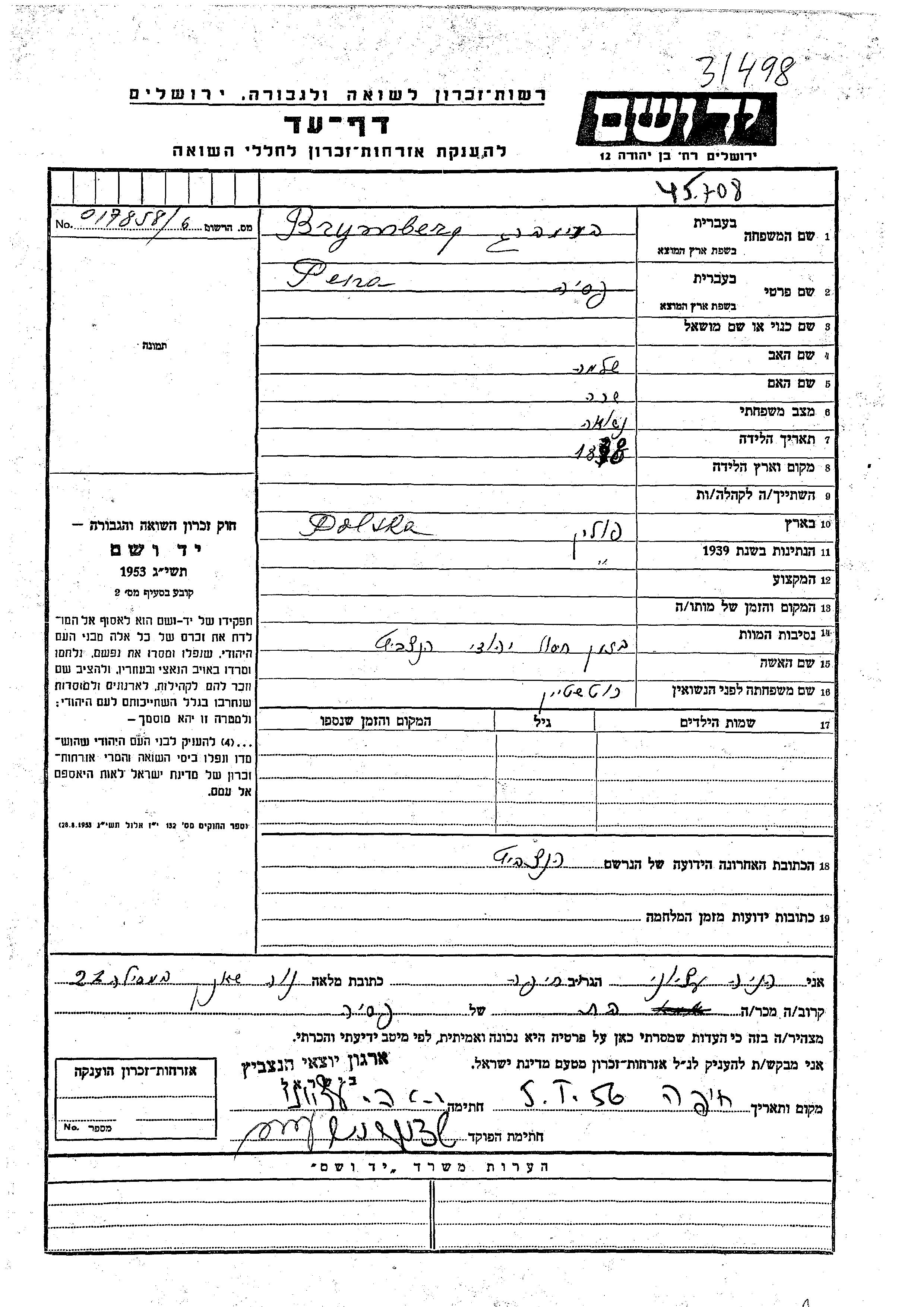 Pesia Brymberg, geb. Brymberg Rotshtein wurde im Jahr 1898 geboren. Sie war die Tochter von Shlomo und Sara. Sie war Verheiratet. Vor dem Zweiten Weltkrieg lebte sie in Polen. Während des Krieges war sie in Hancewicze, Polen.