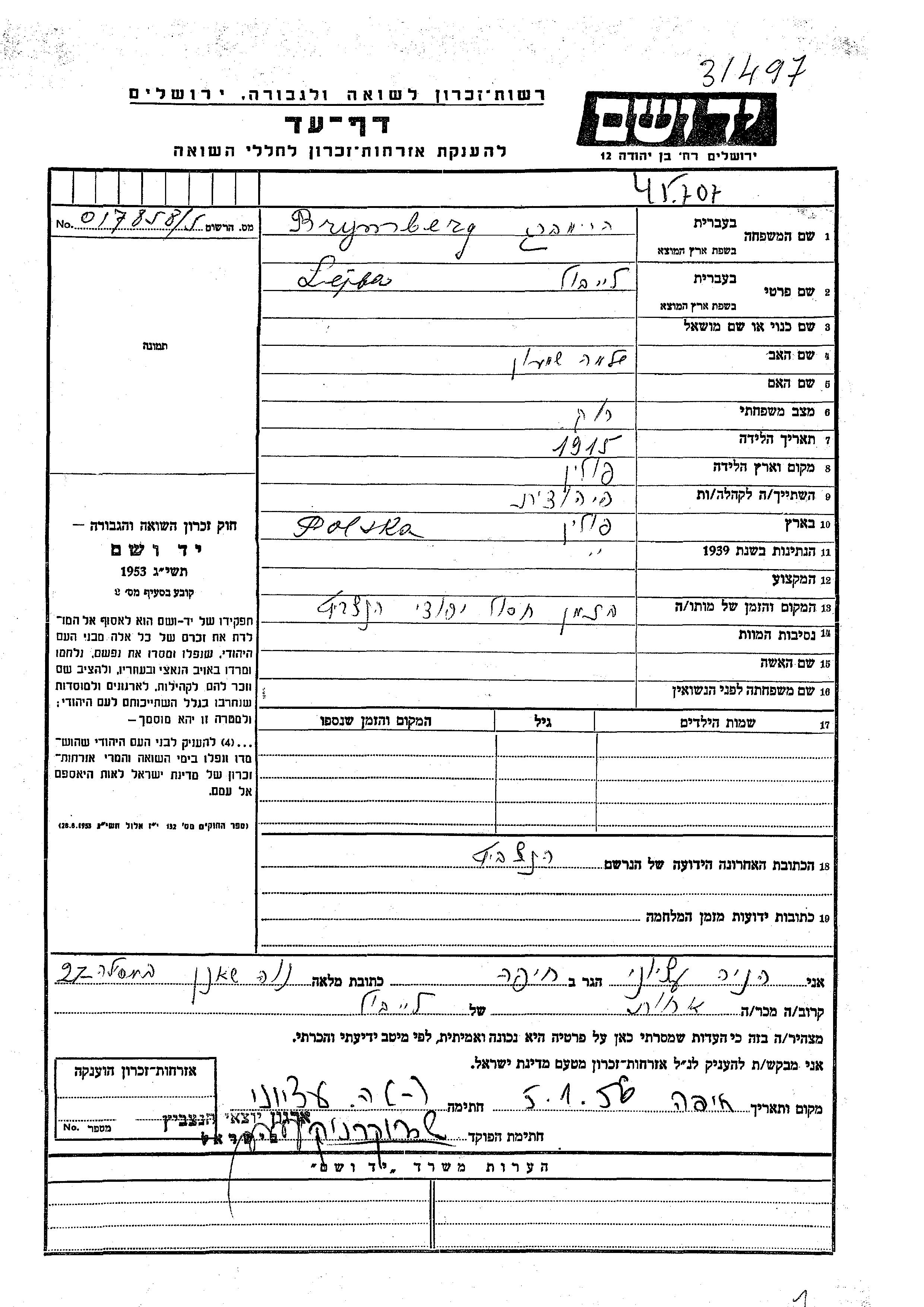Lejba Leib Brymberg wurde im Jahr 1915 in Polen geboren. Er war der Sohn von Shlomo Shimon. Er war Ledig. Vor dem Zweiten Weltkrieg lebte er in Hancewicze, Polen.