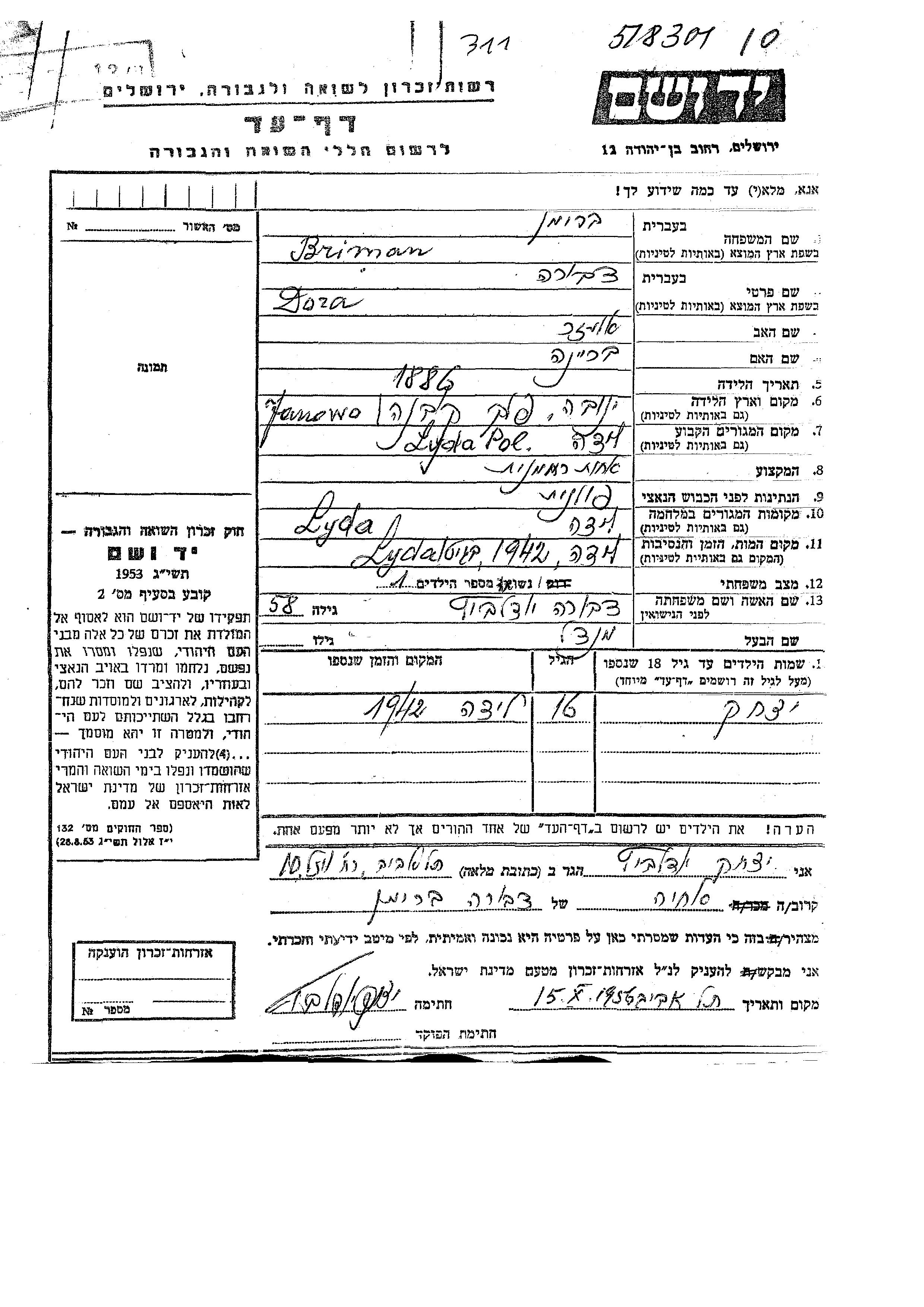 Dora Dvora Briman, geb. Iudelevich wurde im Jahr 1886 in Janowa, Litauen geboren. Sie war die Tochter von Elazar und Breina. Sie war Krankenpfleger/-in und mit Mendel Verheiratet. Vor dem Zweiten Weltkrieg lebte sie in Lida, Polen. Während des Krieges war sie in Lida, Polen.
