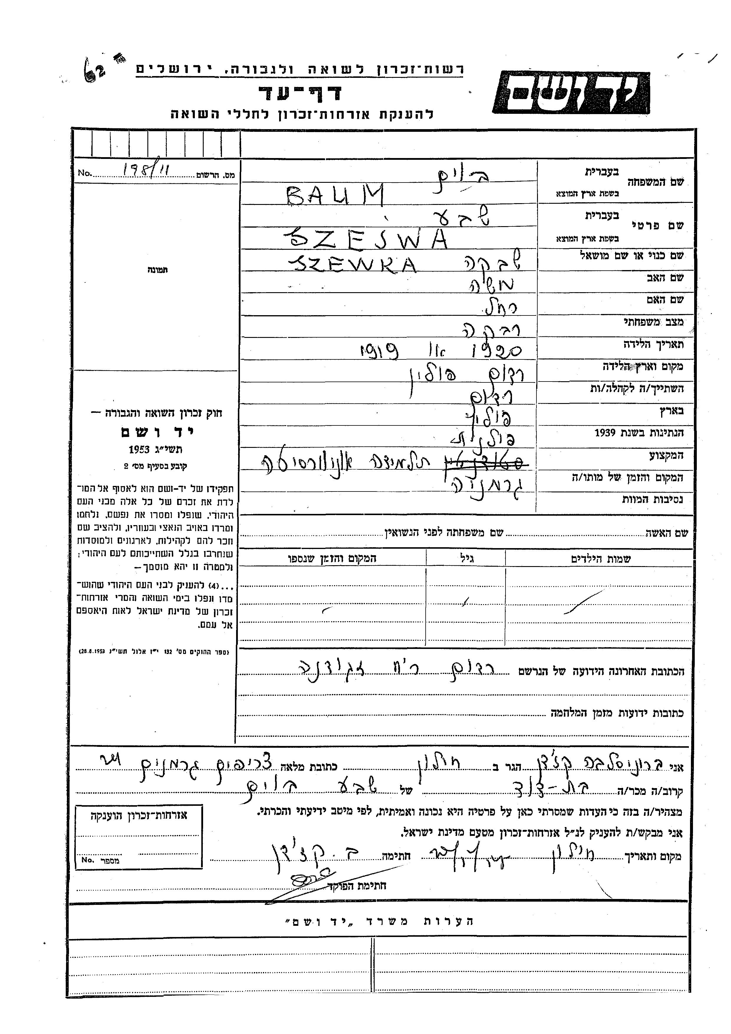 Batsheva Baum wurde im Jahr 1919 in Radom, Polen geboren. Sie war die Tochter von Moshe und Rakhel. Sie war Schüler/-in. Während des Krieges war sie in Radom, Polen.